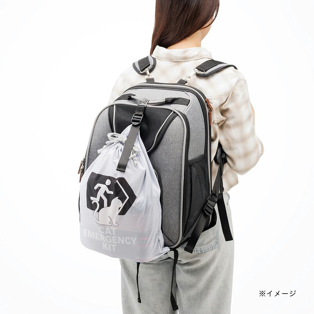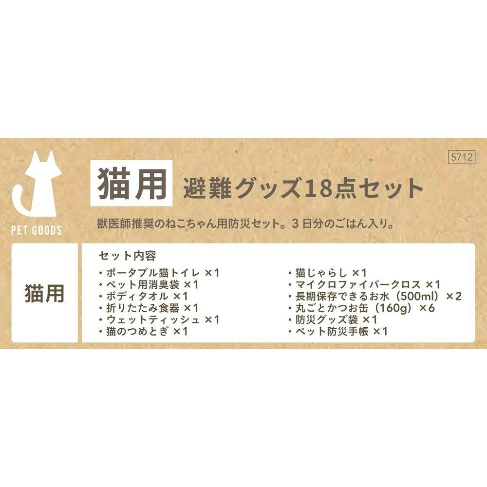 トイレ、消臭袋、ボディタオル、折りたたみ食器、ウェットティッシュ、つめとぎ、猫じゃらし、マイクロファイバークロス、お水、缶詰、防災手帳、避難袋