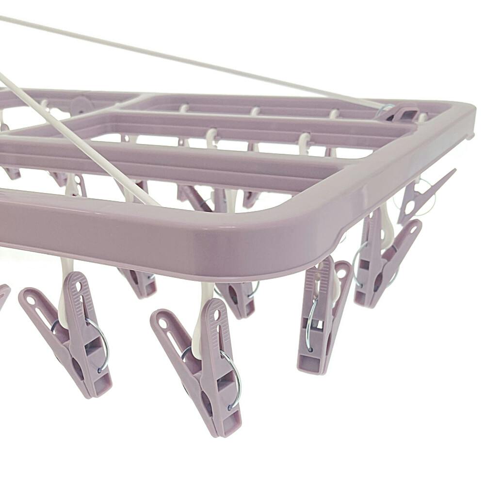 ●補強構造:干す時のフレームの反りを抑えるために中心を壁で補強した構造。●竿キャッチ(対応寸法:直径2.5~3.9cm):太竿から細竿までしっかりキャッチ。鴨居フックで室内干しもできる。