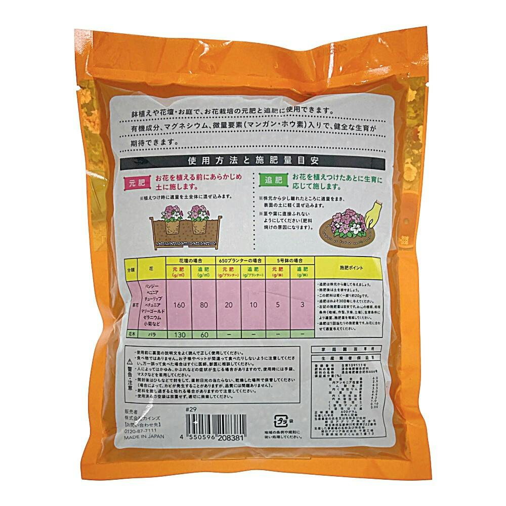 鉢植えや花壇・お庭でお花栽培の元肥・追肥にで使用できます。有機・苦土・微量要素入りで健全なお花を育てます。