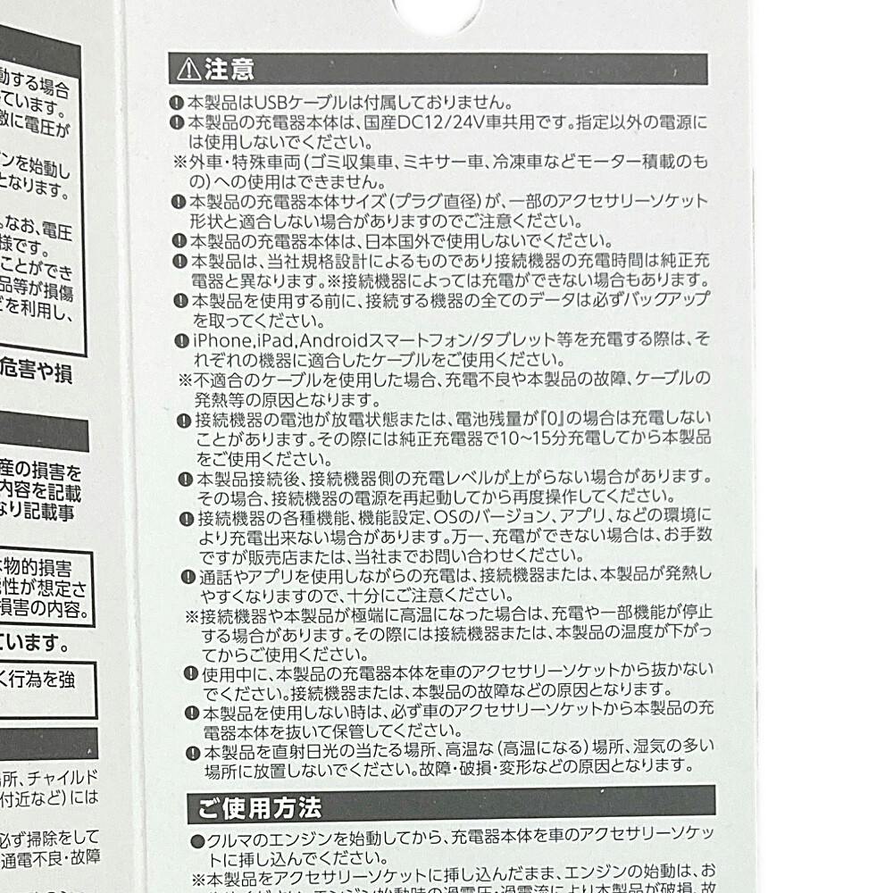 本製品の充電器本体は、国産DC12/24V車共用です。指定以外の電源には使用しないでください。