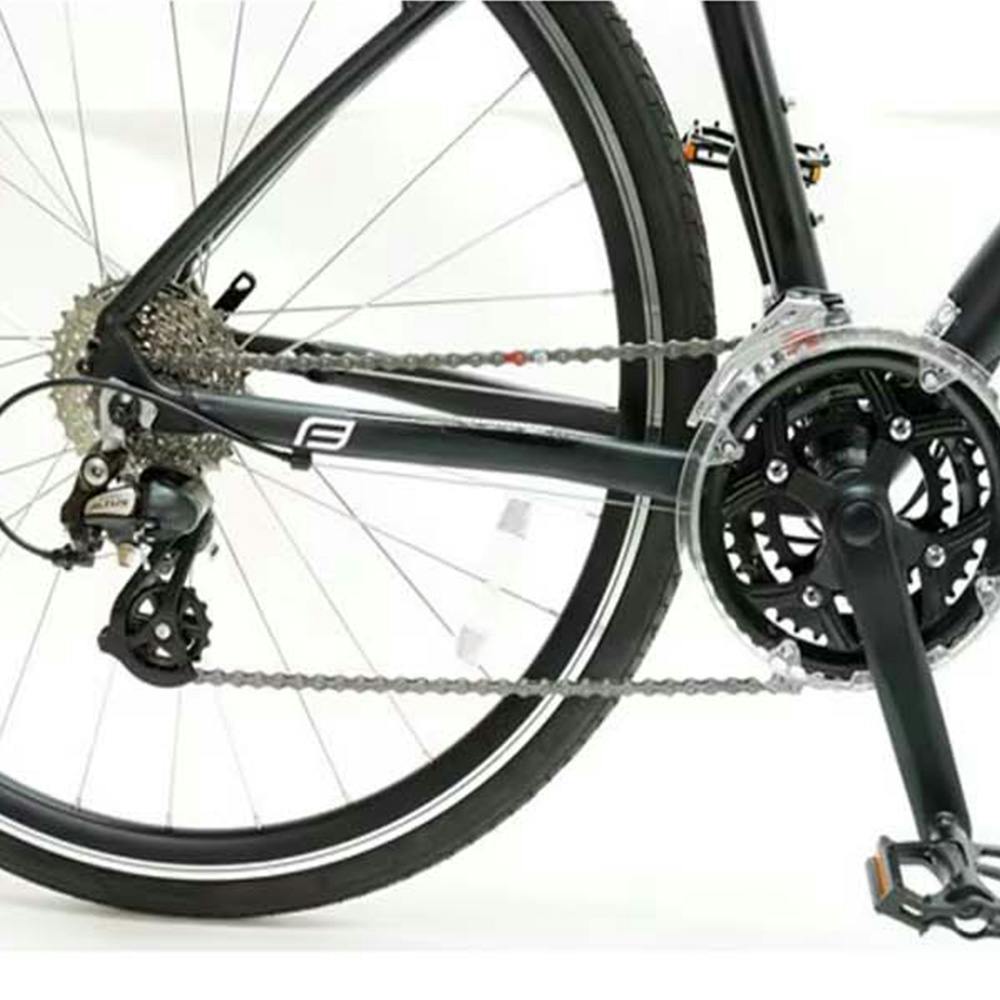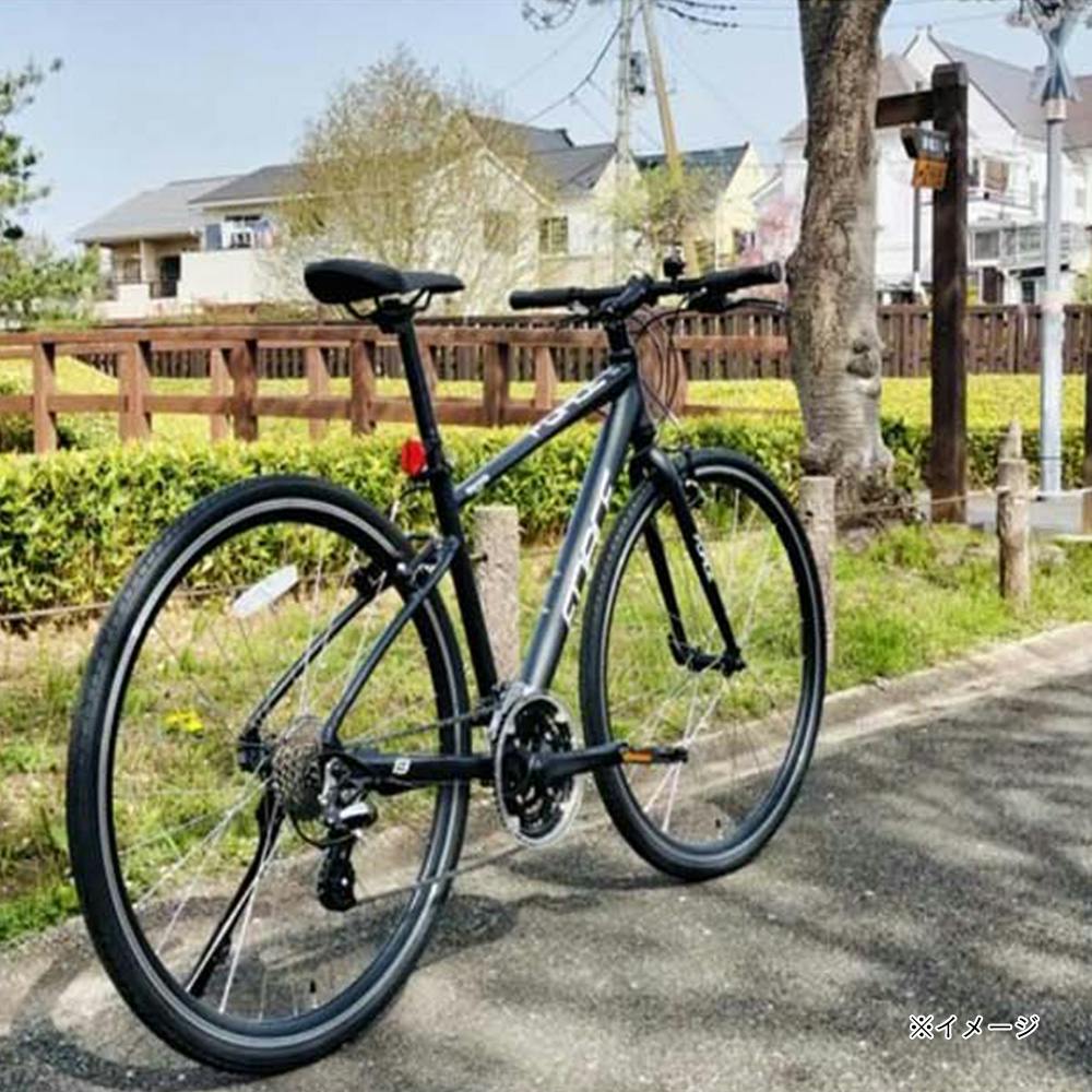 制動力のあるVブレーキを装備。手のひらを面で支え、疲れにくいエルゴ形状のグリップを採用。すその?み込みや汚れを防ぐチェーンガードを装備することで通勤、通学、サイクリングにも最適なクロスバイク。フレームインナーチューブ採用で見た目もスタイリッシュに。