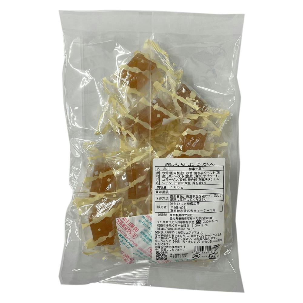 水飴(国内製造)、砂糖、焼き芋ペースト(国産)、栗ペースト(国産)、寒天、オブラート、コラーゲン/香料、着色料(酸化チタン)、レシチン、(一部に大豆・豚を含む)