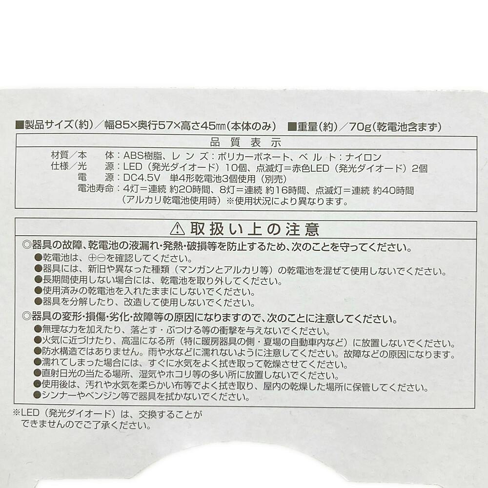 ●乾電池は、プラスマイナスを確認してください。 ●長時間使用しない場合には乾電池を取り外してください。 ●防水構造ではありません。雨や水などにぬれないように注意してください。故障などの原因になります。 ●LED(発光ダイオード)は交換することができません。