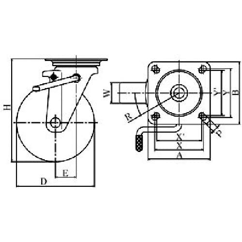 【CAINZ-DASH】ユーエイ キャスター事業部 プレート式 自在 キャスター ウレタン 車輪径200mm ストッパー付き PMタイプ PMS-LB(R)型 取付寸法120×120(105×105) PMS-200GUBLB(R)【別送品】