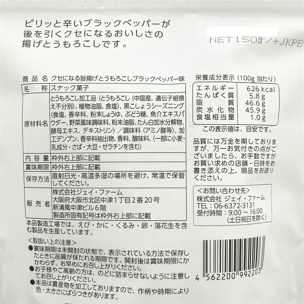 とうもろこし加工品(とうもろこし(中国産、遺伝子組換え不分別)、植物油脂、食塩)、黒こしょうシーズニング(食塩、香辛料、粉末しょうゆ、ぶどう糖、魚介エキスパウダー、野菜風味調味料、粉末油脂、たん白加水分解物、酵母エキス、デキストリン)/調味料(アミノ酸等)