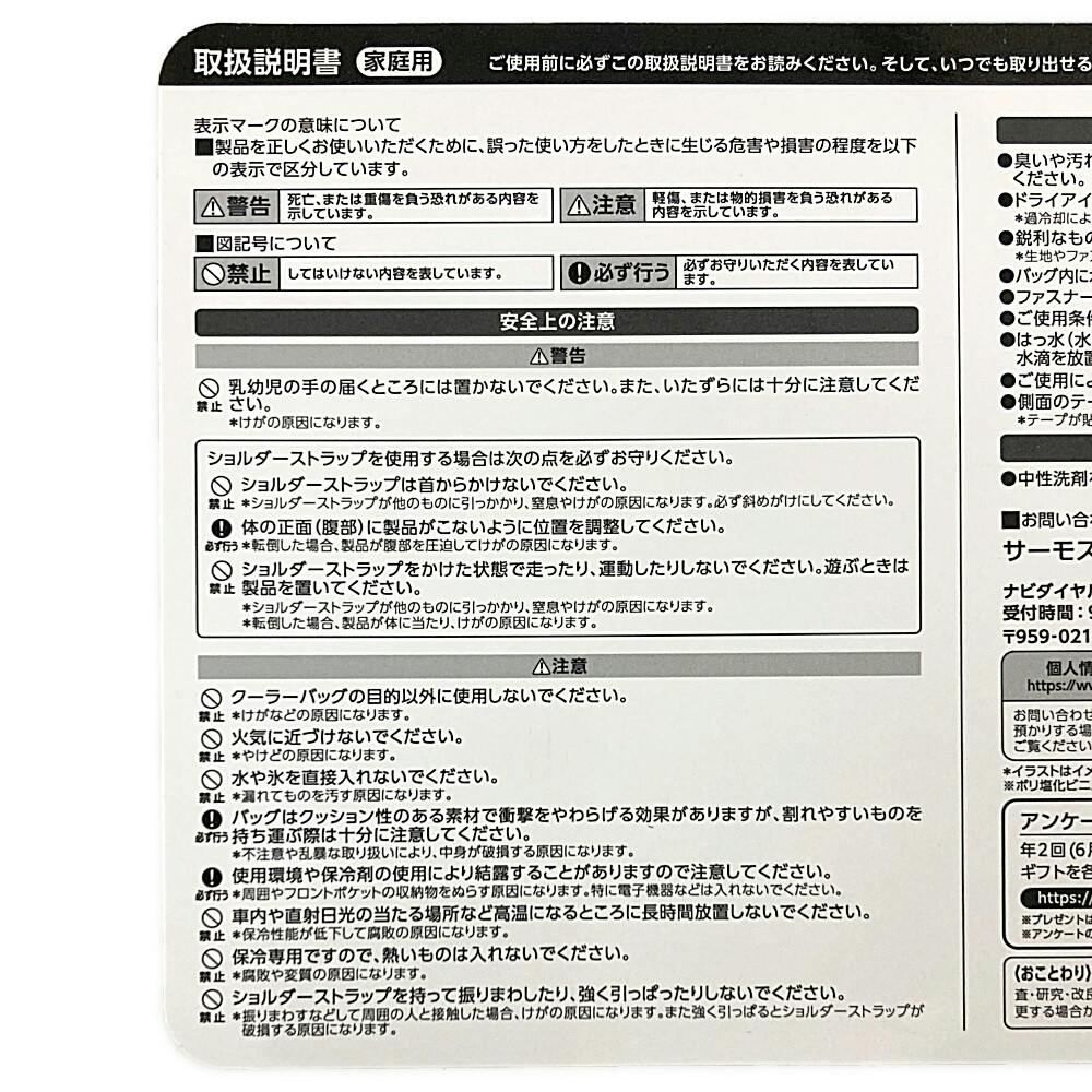 ●クーラーバッグの目的以外に使用しないでください。●火気に近づけないでください。●水や氷を直接入れないでください。●バッグはクッション性のある素材で衝撃をやわらげる効果がありますが、倒れやすいものを持ち運ぶ際は十分に注意してください。など
