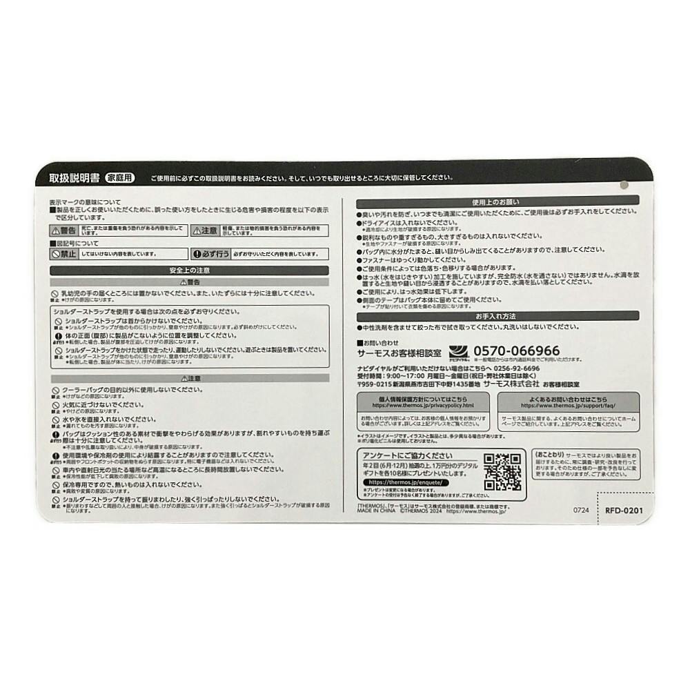 ●クーラーバッグの目的以外に使用しないでください。●火気に近づけないでください。●水や氷を直接入れないでください。●バッグはクッション性のある素材で衝撃をやわらげる効果がありますが、割れやすいものを持ち運ぶ際は十分に注意してください。など