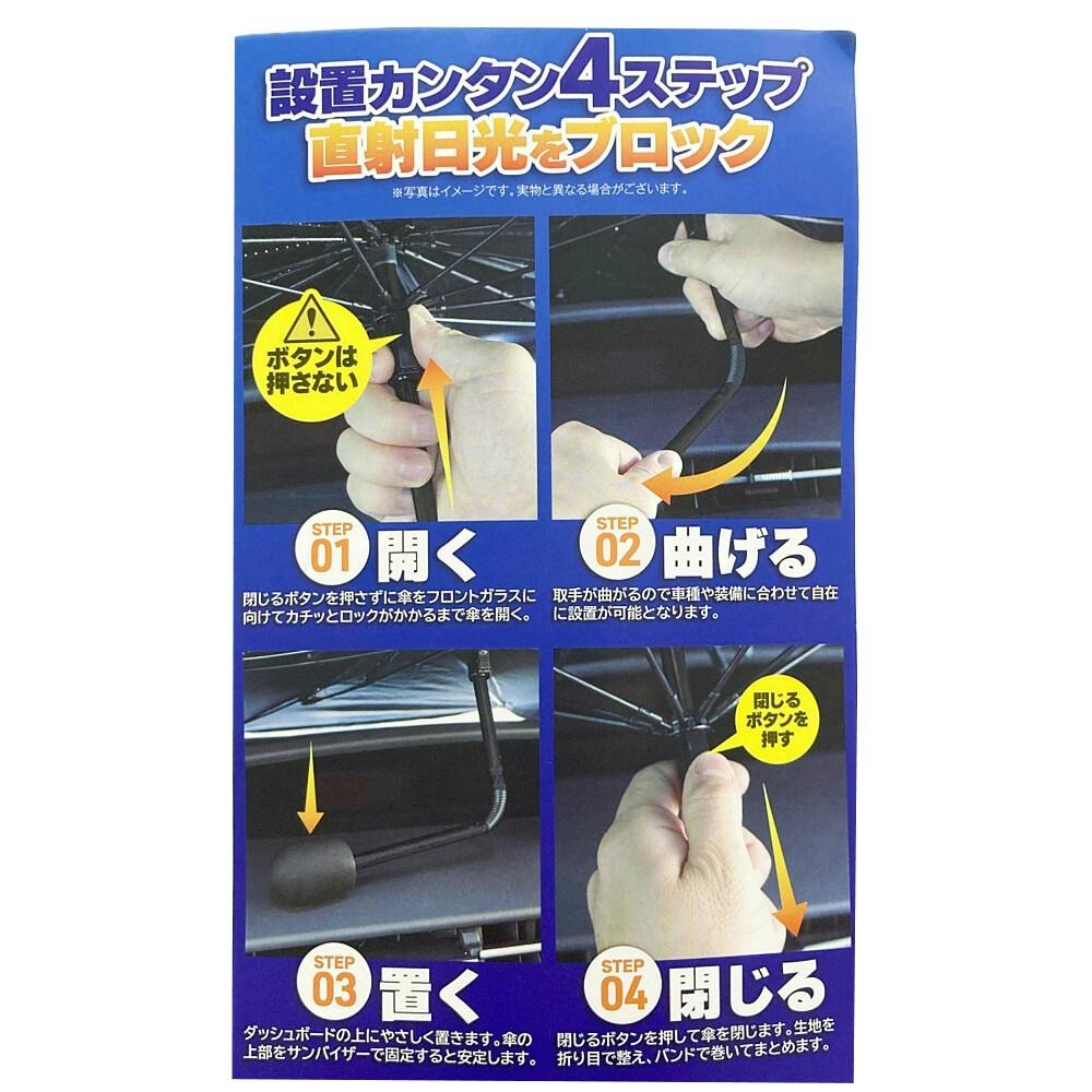 1.開く/閉じるボタンを押さずに傘をフロントガラスに向けてカチッとロックがかかるまで傘を開く。2.曲げる/取手が曲がるので車種や装備に合わせて自在に設置が可能となります。3.置く/ダッシュボードの上にやさしく置きます。など