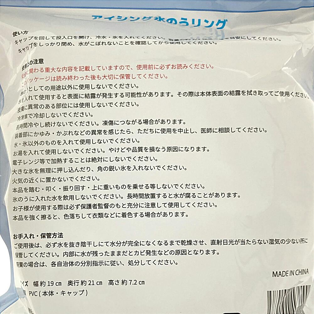 氷のうとしての用途以外使用しないで下さい・冷蔵庫で冷却しないで下さい・水、氷以外のものを入れて使用しないで下さい。・電子レンジ等で加熱することは絶対にしないで下さい。・火気の近くに置かないで下さい。