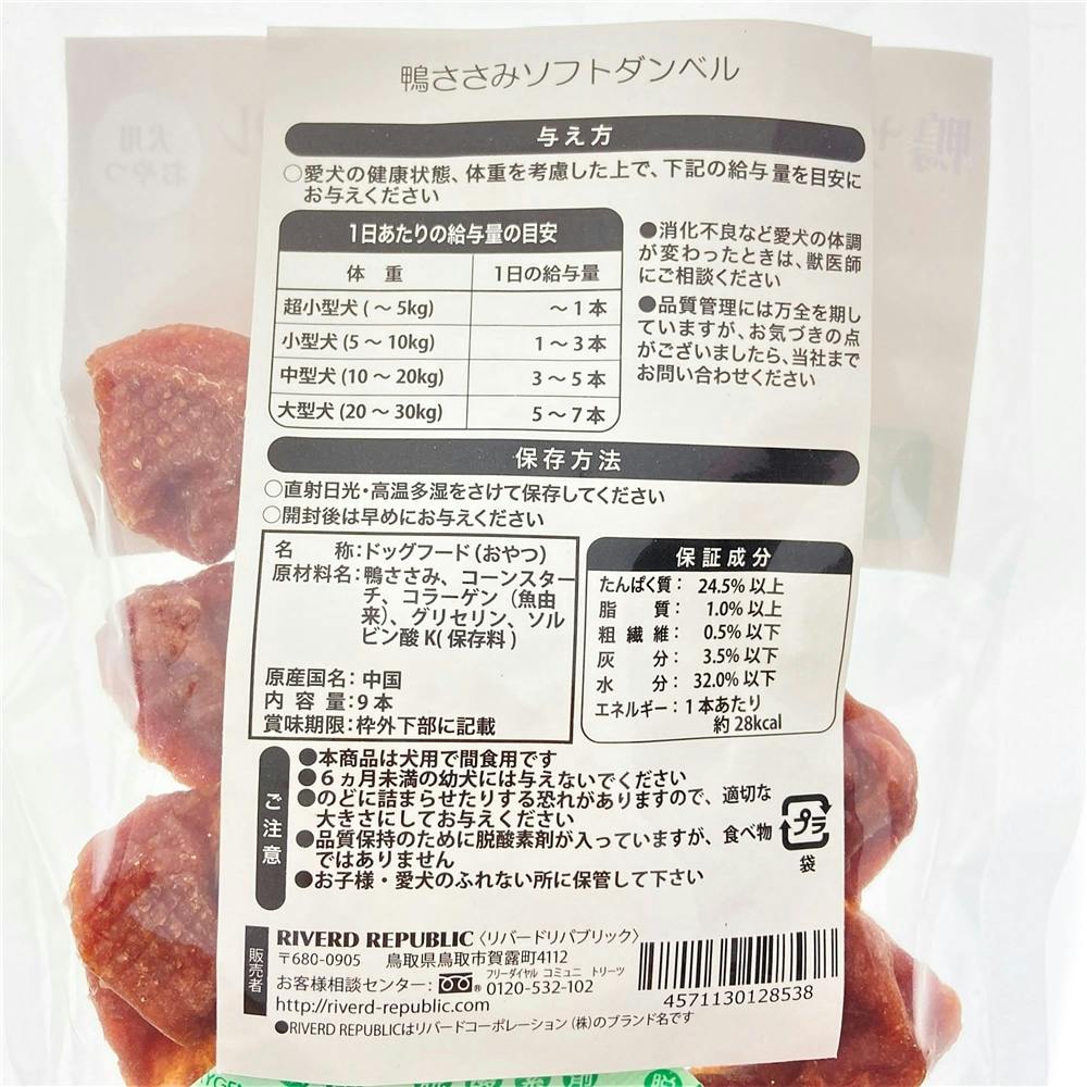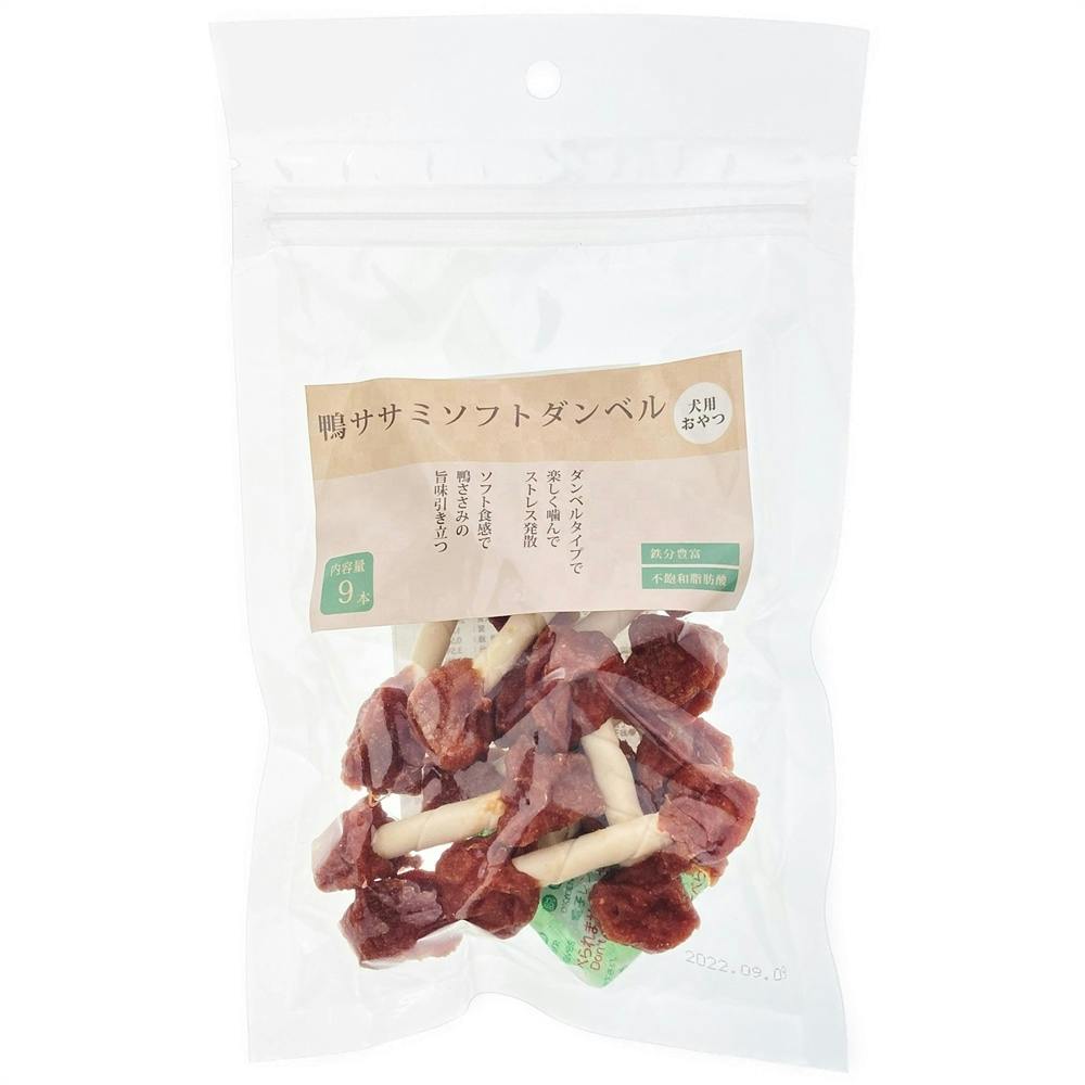 ダンベルタイプで楽しく噛んでストレス発散。ソフト食感で鴨ささみの旨味引き立つ。