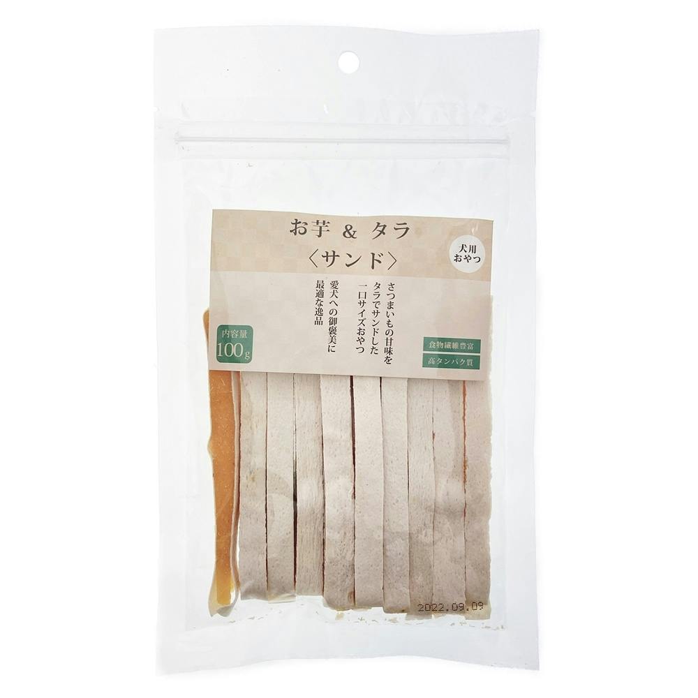 さつまいもの甘味をタラでサンドした一口サイズのおやつ。愛犬への御褒美に最適な逸品。