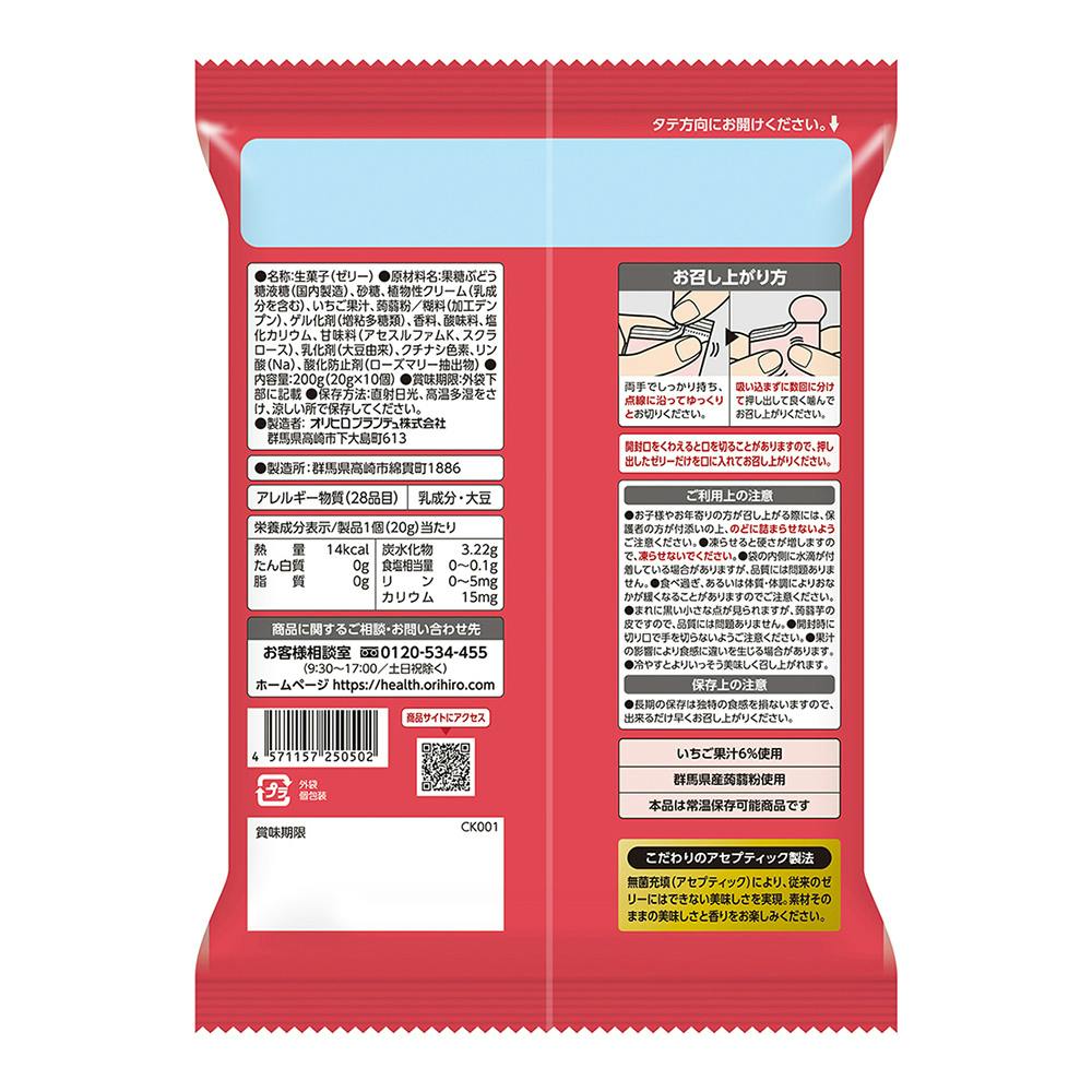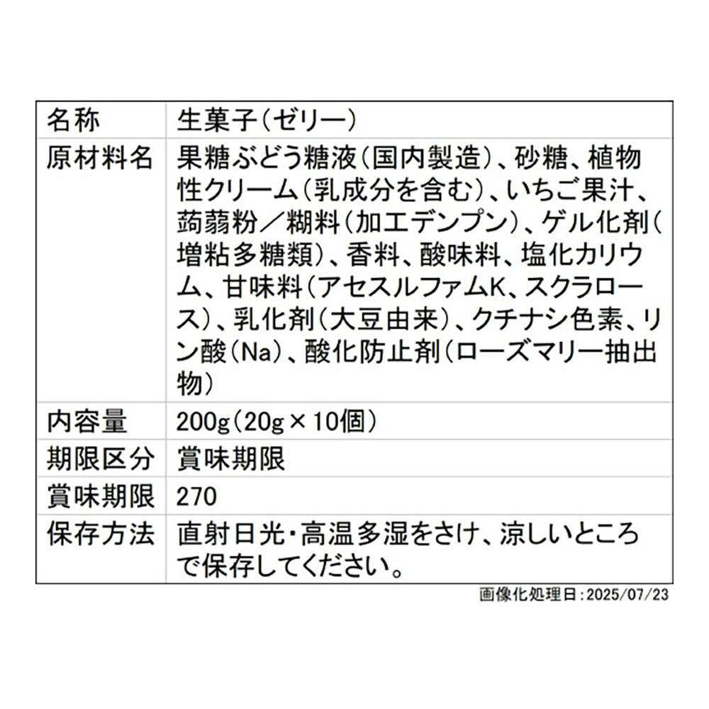 果糖ぶどう糖液(国内製造)、砂糖、植物性クリーム(乳成分を含む)、いちご果汁、蒟蒻粉/糊料(加工デンプン)、ゲル化剤(増粘多糖類)、香料、酸味料、塩化カリウム、甘味料(アセスルファムK、スクラロース)、乳化剤(大豆由来)、クチナシ色素、リン酸(Na)他