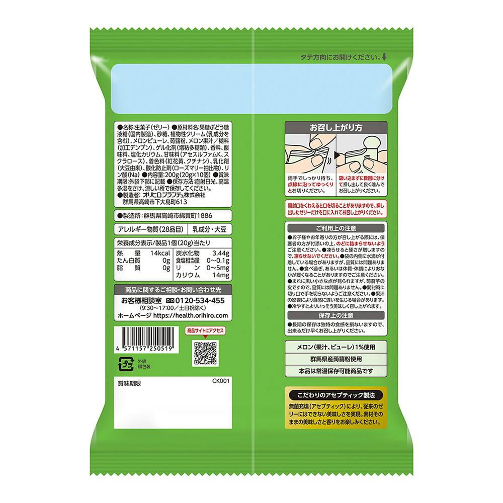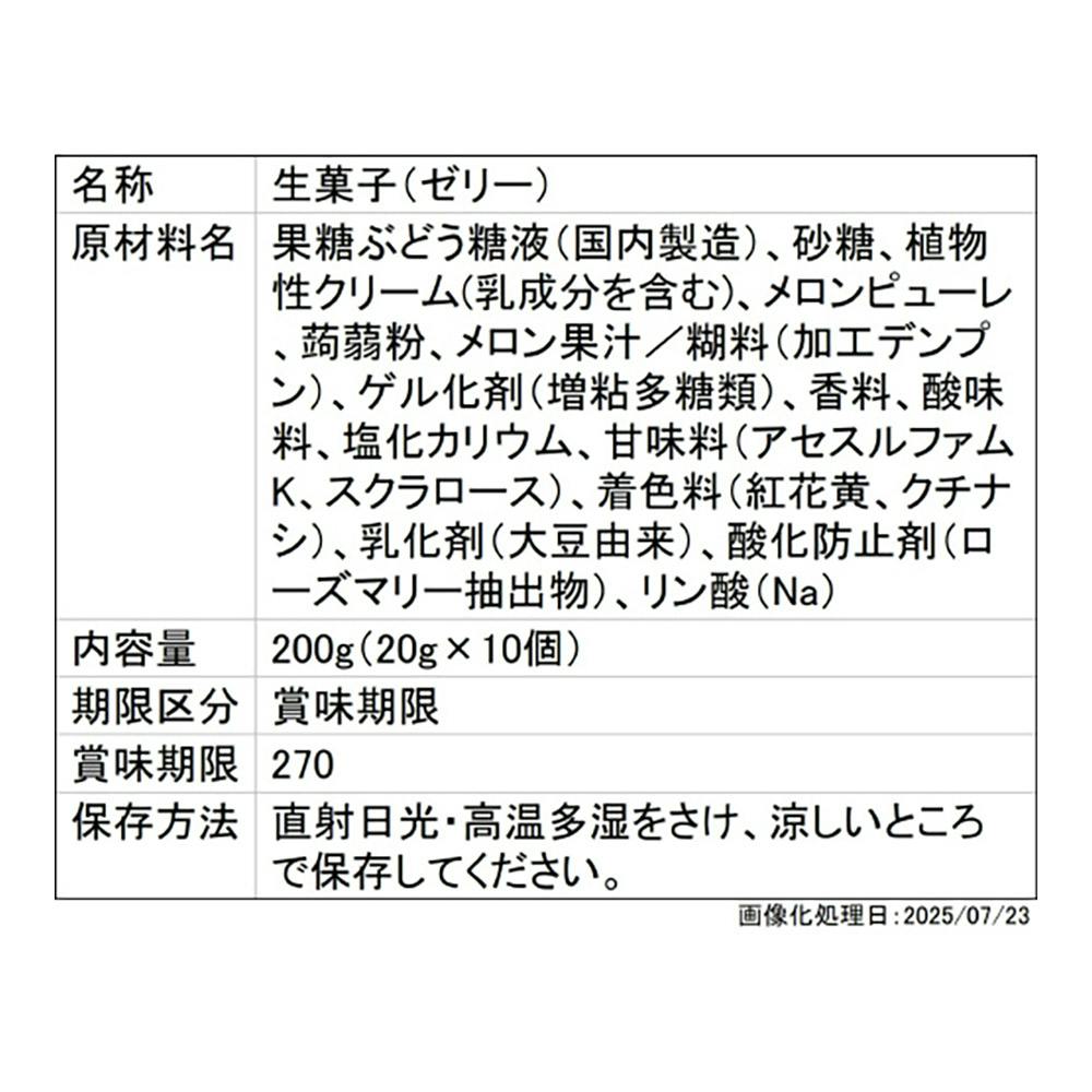 果糖ぶどう糖液(国内製造)、砂糖、植物性クリーム(乳成分を含む)、メロンピューレ、蒟蒻粉、メロン果汁/糊料(加工デンプン)、ゲル化剤(増粘多糖類)、香料、酸味料、塩化カリウム、甘味料(アセスルファムK、スクラロース)、着色料(紅花黄、クチナシ)、乳化剤他