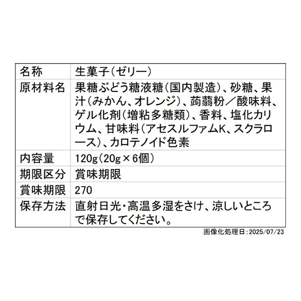 果糖ぶどう糖液糖(国内製造)、砂糖、果汁(みかん、オレンジ)、蒟蒻粉/酸味料、ゲル化剤(増粘多糖類)、香料、塩化カリウム、甘味料(アセスルファムK、スクラロース)、カロテノイド色素