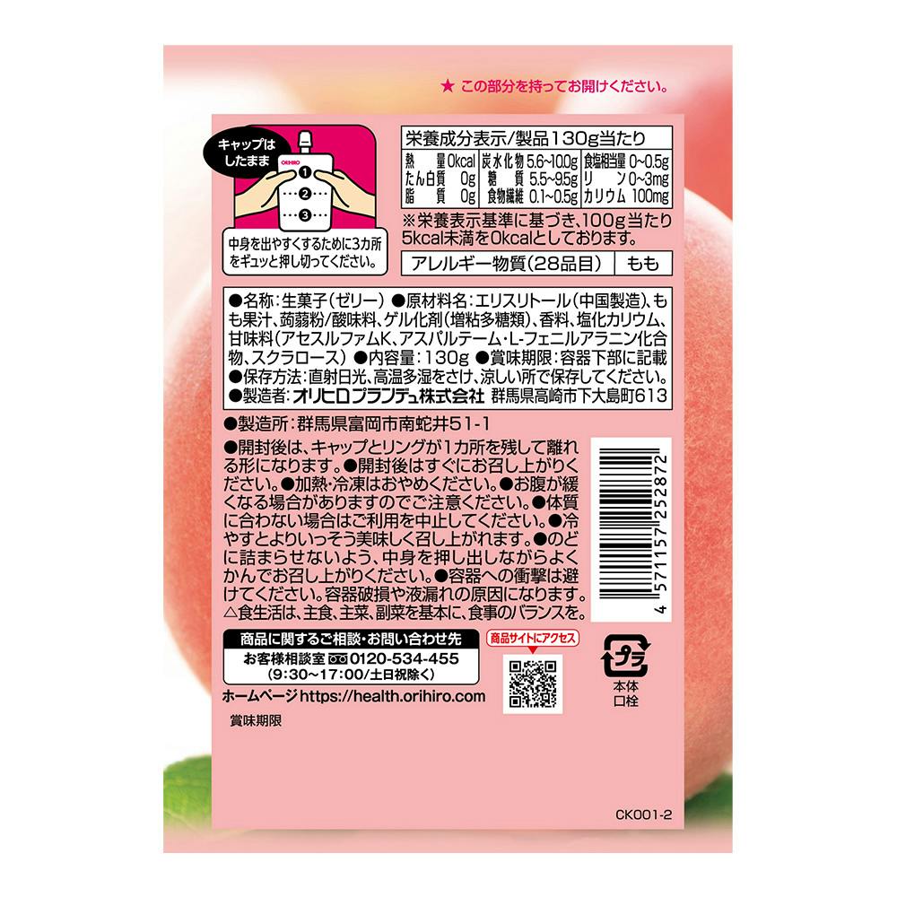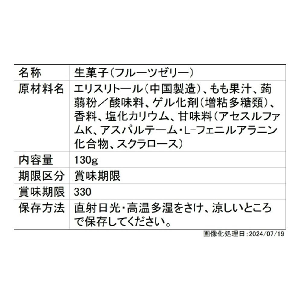エリスリトール(中国製造)、もも果汁、蒟蒻粉/酸味料、ゲル化剤(増粘多糖類)、香料、塩化カリウム、甘味料(アセスルファムK、アスパルテーム・L-フェニルアラニン化合物、スクラロース)