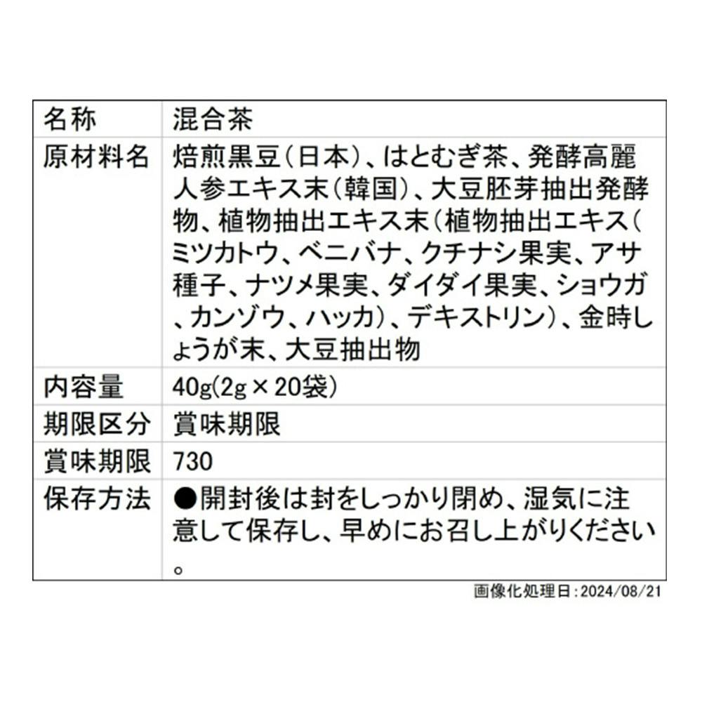 焙煎黒豆(日本)、はとむぎ茶、発酵高麗人参エキス末(韓国)、大豆胚芽抽出発酵物、植物抽出エキス末(植物抽出エキス(ミツカトウ、ベニバナ、クチナシ果実、アサ種子、ナツメ果実、ダイダイ果実、ショウガ、カンゾウ、ハッカ)、デキストリン)、金時しょうが末他