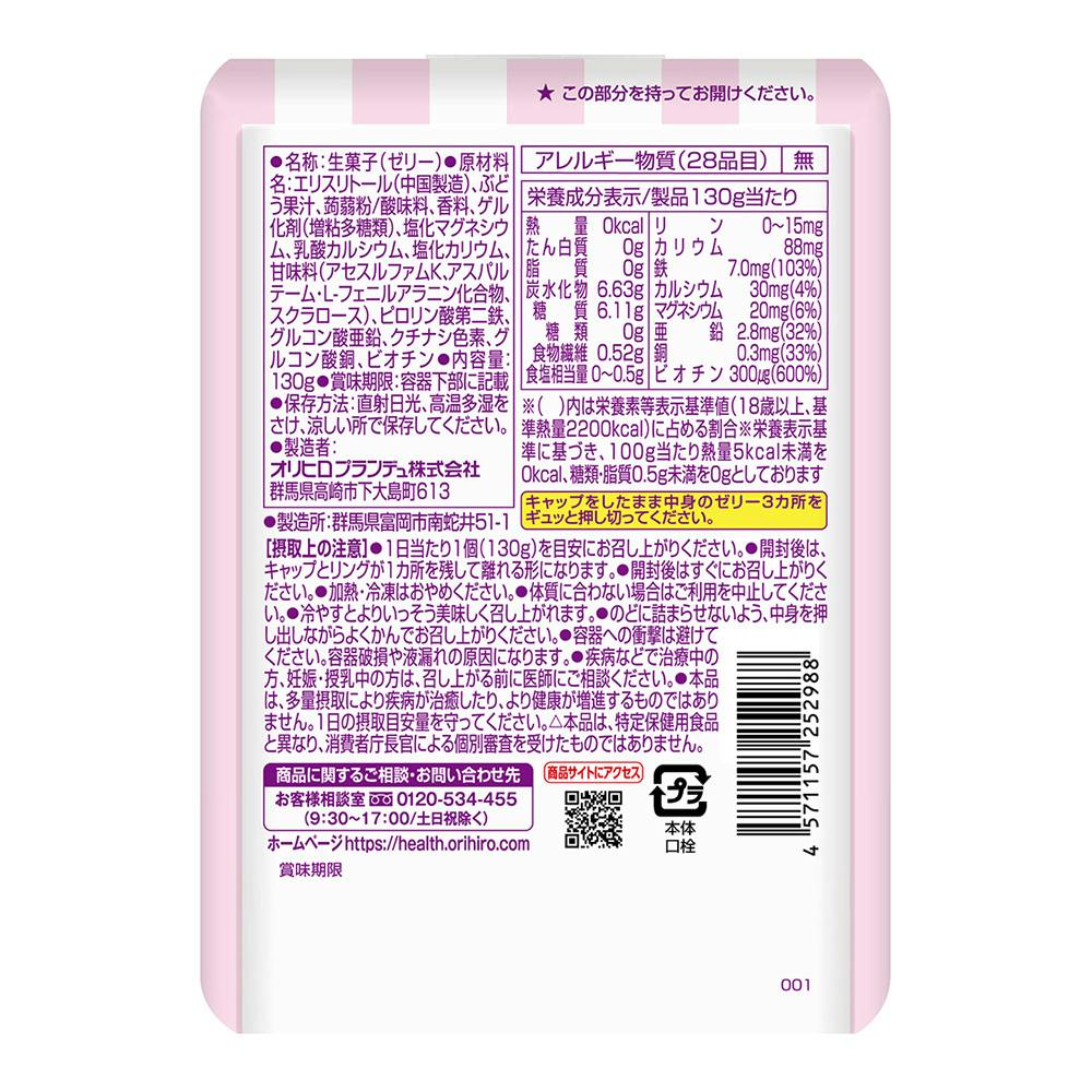 鉄・マルチミネラル・ビオチン配合の蒟蒻ゼリー。カロリー0、脂質0、糖類0のトリプルゼロ。