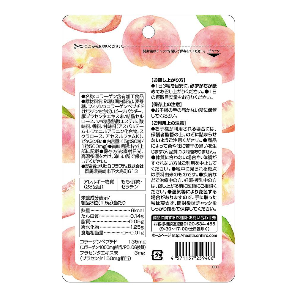 砂糖(国内製造)、麦芽糖、フィッシュコラーゲンペプチド(ゼラチンを含む)、ピーチパウダー、豚プラセンタエキス末/結晶セルロース、ショ糖脂肪談エステル、酸味料、甘味料(アスパルテーム・L-フェニルアラニン化合物、スクラロース、アセスルファムK)