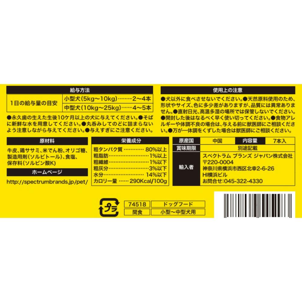 牛皮、鶏ササミ、米でん粉、オリゴ糖、製造用剤(ソルビトール)、食塩、保存料(ソルビン酸K)