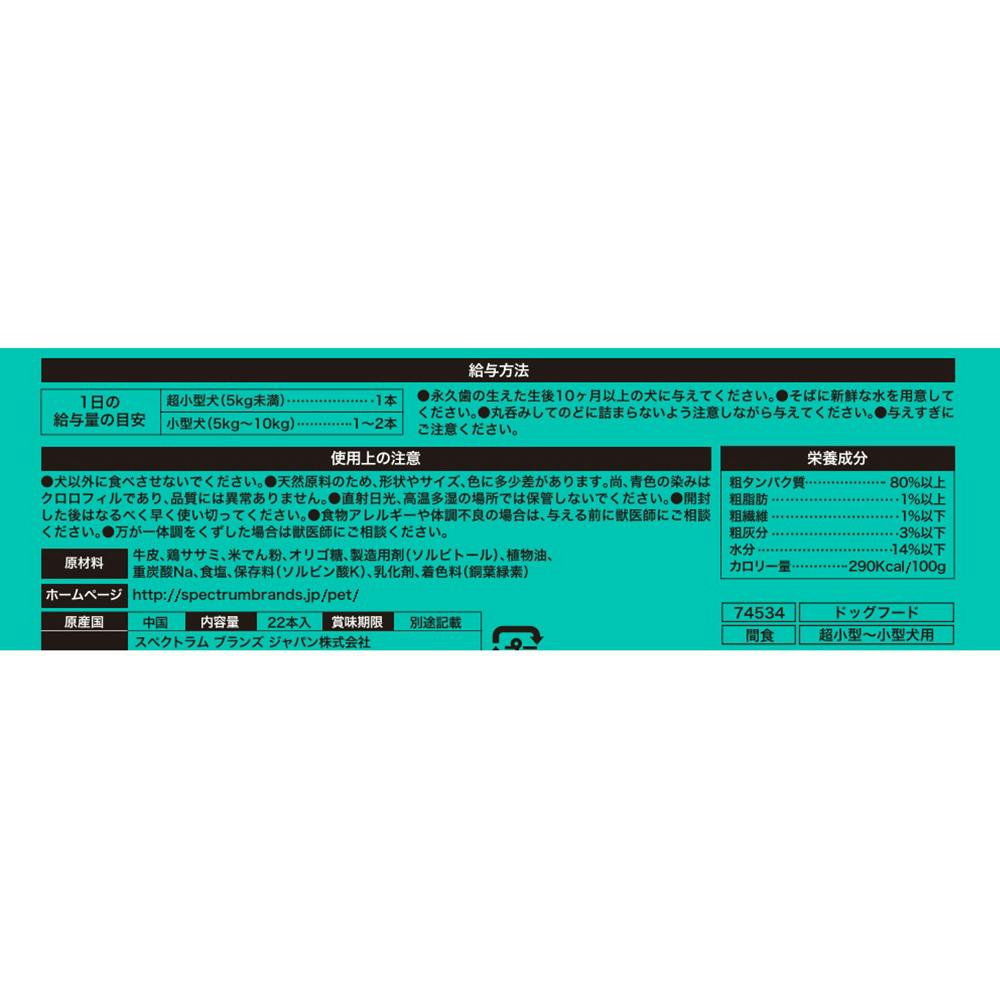 牛皮、鶏ササミ、米でん粉、オリゴ糖、製造用剤(ソルビトール)、植物油、重炭酸Na、食塩、保存料(ソルビン酸K)、乳化剤、着色料(銅葉緑素)