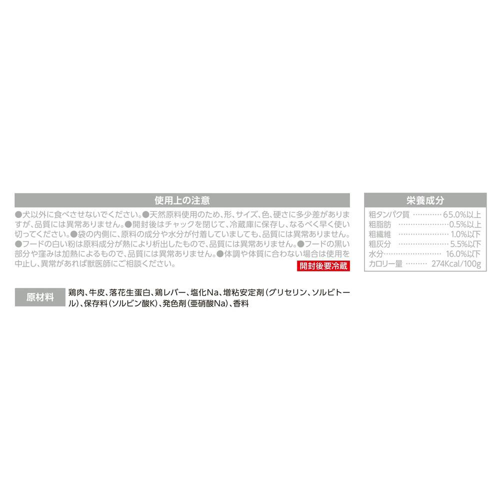 鶏肉、牛皮、落花生たん白、鶏レバー、塩化Na、増粘安定剤(グリセリン、ソルビトール)、保存料(ソルビン酸K)、発色剤(亜硝酸Na)、香料