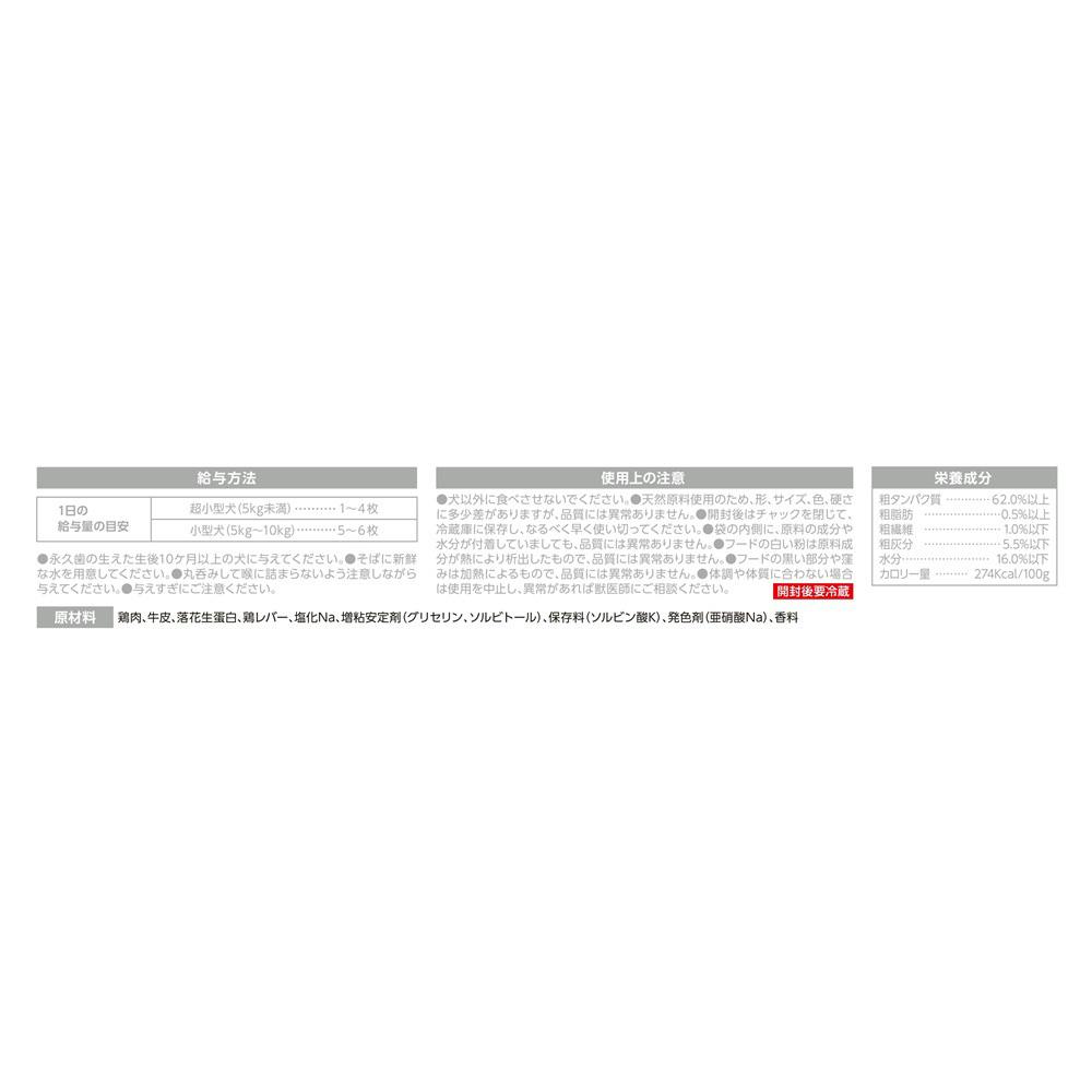 1日あたりの給与量の目安・・・超小型犬(5kg未満)1~4枚、小型犬(5~10kg)5~6枚。 永久歯の生えた生後10ヶ月以上の犬に与えてください。そばに新鮮な水を用意してください。
