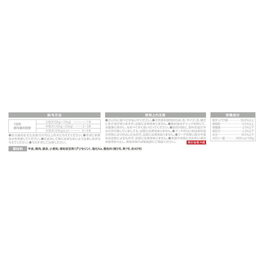 牛皮、鶏肉、豚皮、小麦粉、増粘安定剤(グリセリン)、塩化Na、着色料(黄5号、青1号、赤40号)