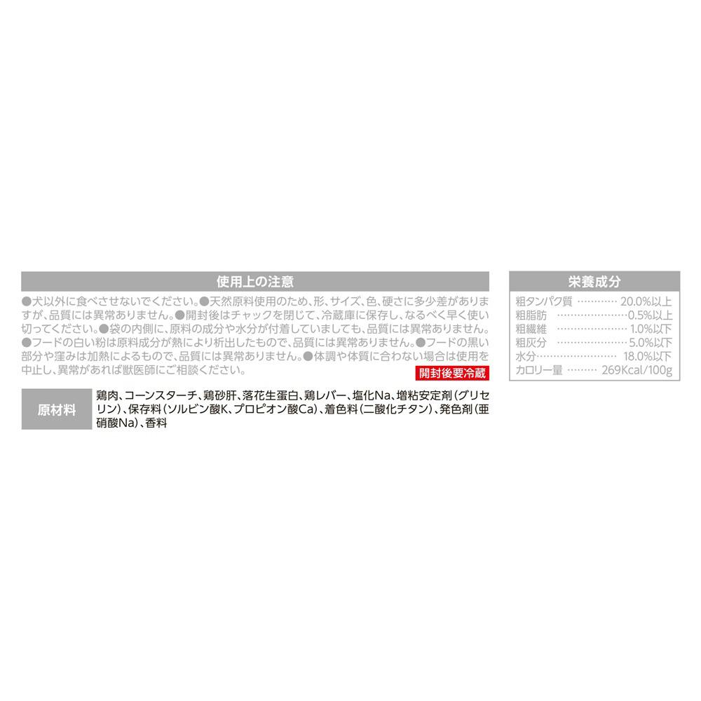 鶏肉、コーンスターチ、鶏砂肝、落花生たん白、鶏レバー、塩化Na、増粘安定剤(グリセリン)、保存料(ソルビン酸K、プロピオン酸Ca)、着色料(二酸化チタン)、発色剤(亜硝酸Na)、香料