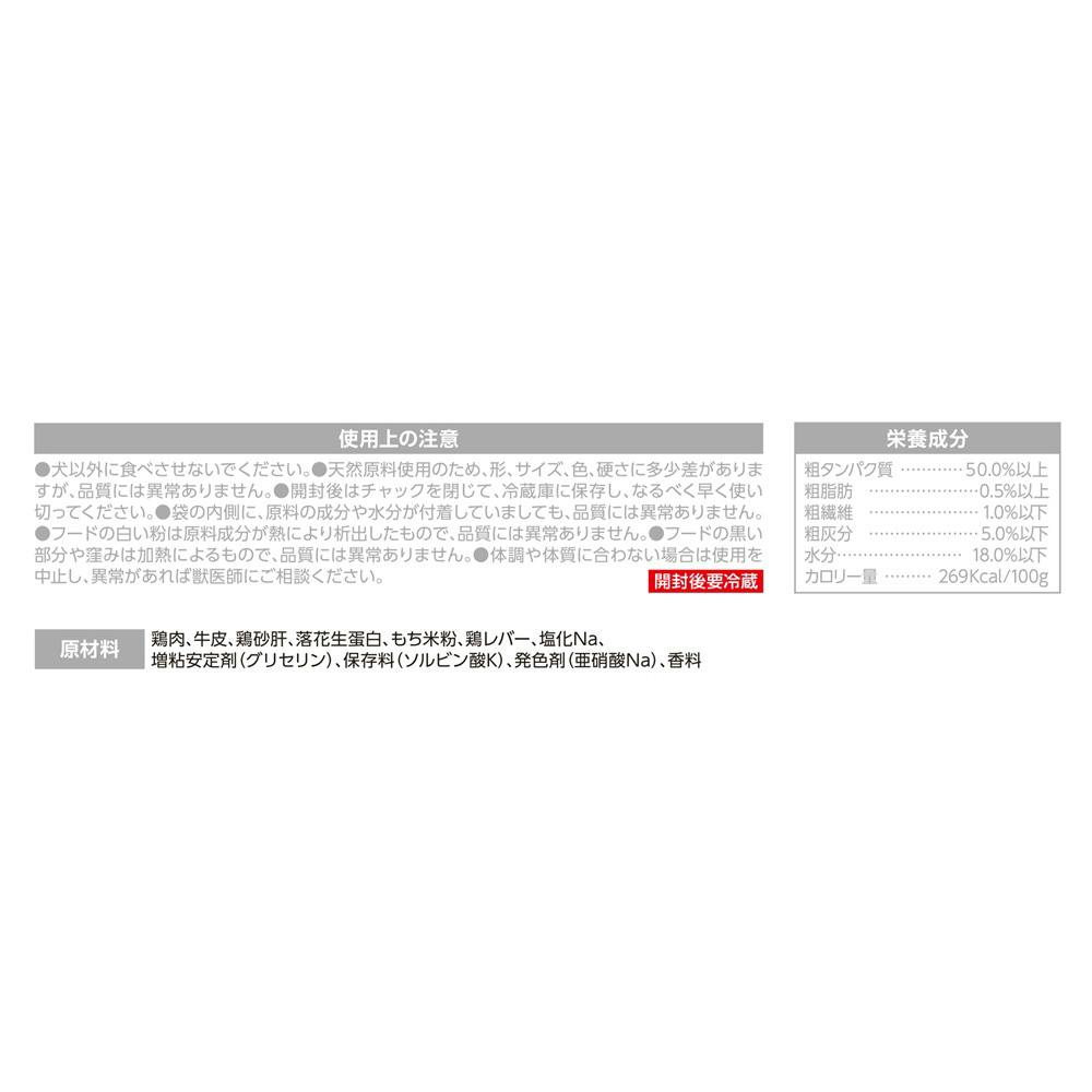 鶏肉、牛皮、鶏砂肝、落花生たん白、もち米粉、鶏レバー、塩化Na、増粘安定剤(グリセリン)、保存料(ソルビン酸K)、発色剤(亜硝酸Na)、香料