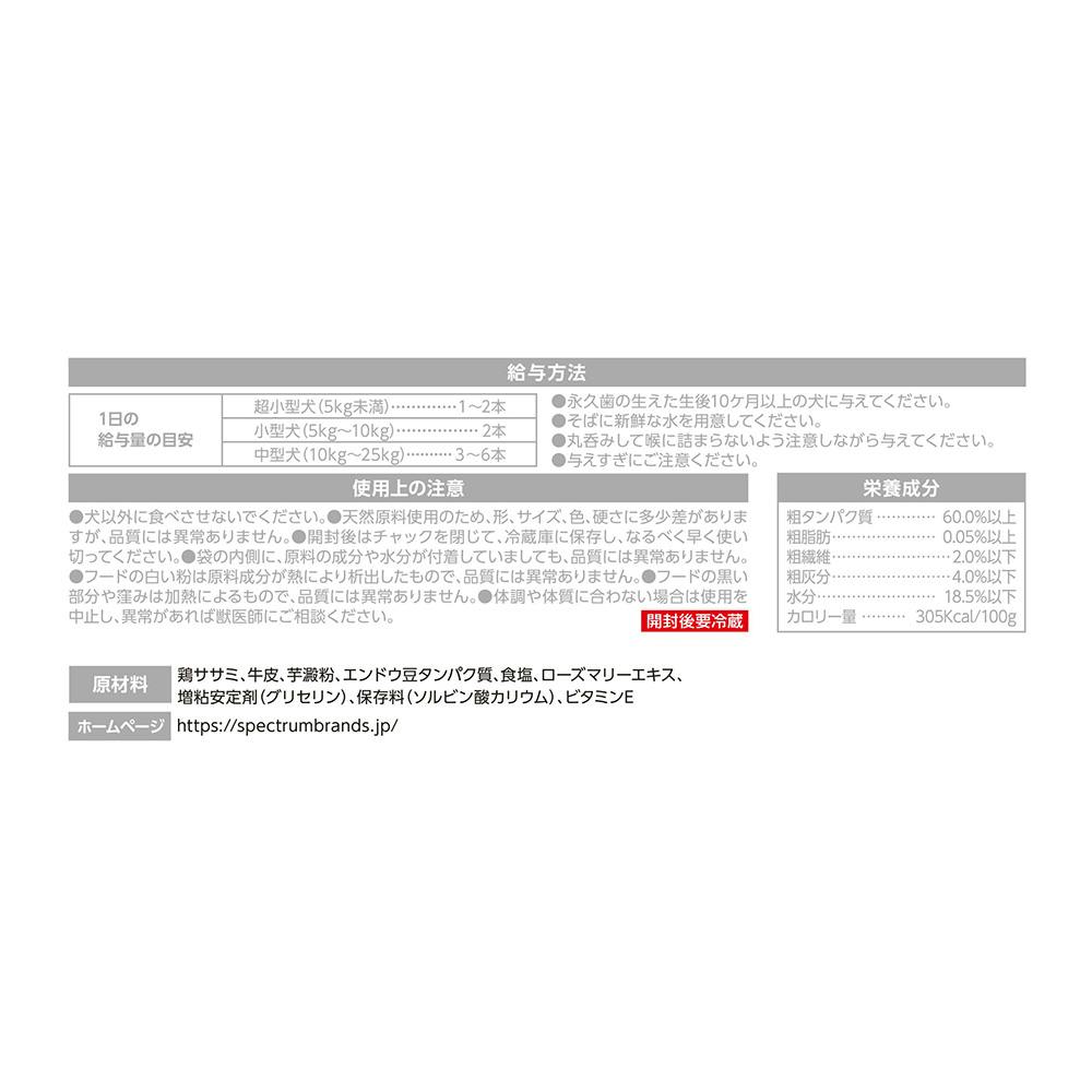 鶏ササミ、牛皮、芋澱粉、エンドウ豆タンパク質、食塩、ローズマリーエキス、増粘安定剤(グリセリン)、保存料(ソルビン酸カリウム)、ビタミンE