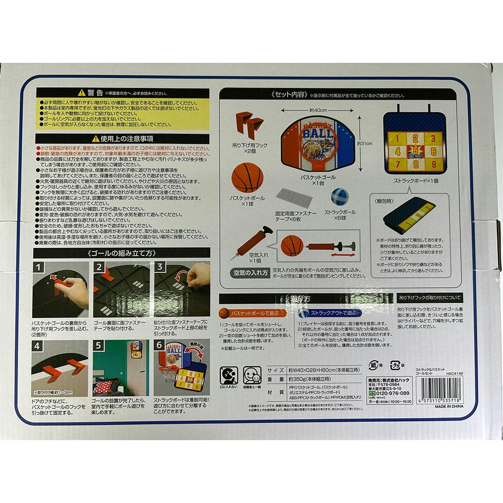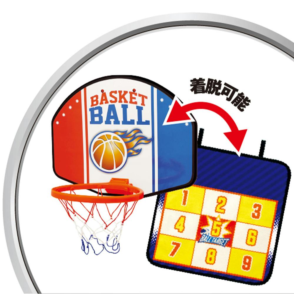 吊り下げフック×2、空気入れ×1、固定用面ファスナー×6枚、バスケットボール×1、バスケットゴール×1、ストラックボード×1、ストラックボール×6
