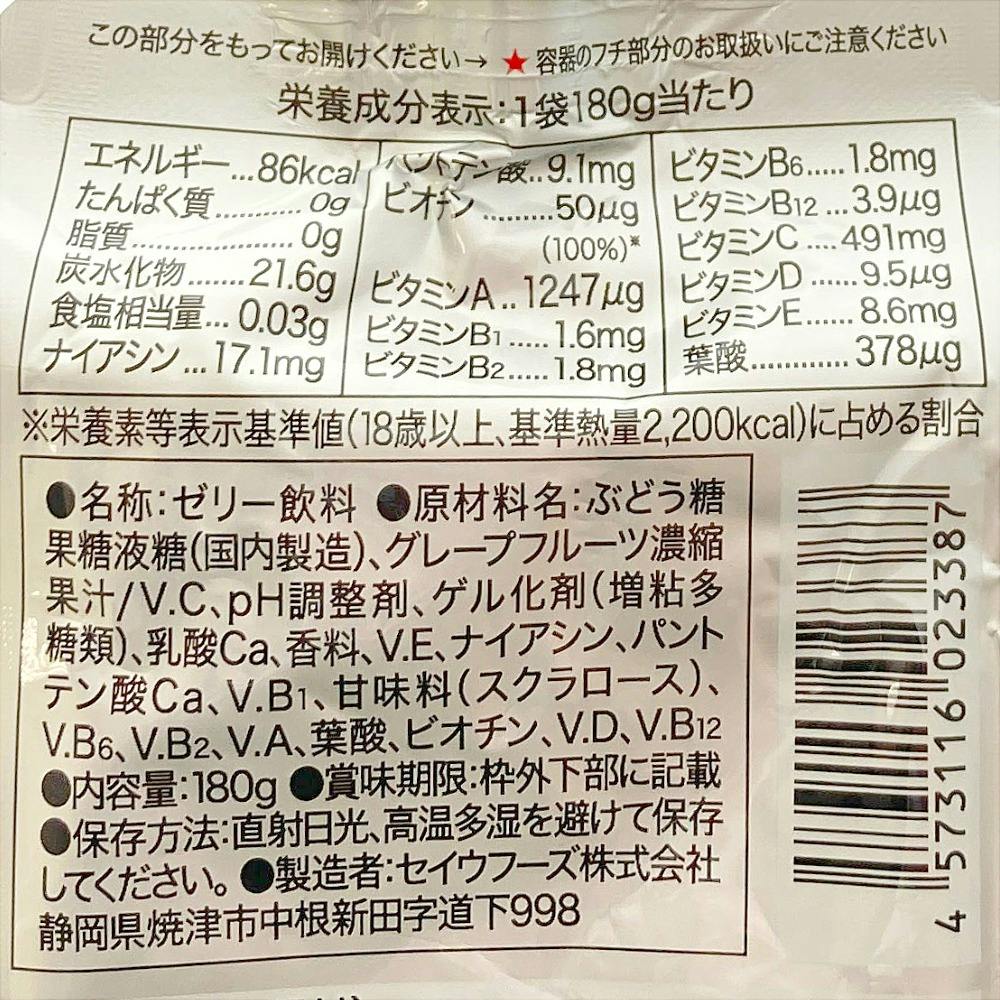 ぶどう糖果糖液糖(国内製造)、グレープフルーツ濃縮果汁/V.C、pH調整剤、ゲル化剤(増粘多糖類)、乳酸Ca、香料、V.E、ナイアシン、パントテン酸Ca、V.B1、甘味料(スクラロース)、V.B6、V.B2、V.A、葉酸、ビオチン、V.D、V.B12