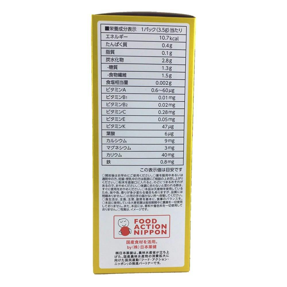 大麦若葉粉末(九州産)、水溶性食物繊維、還元麦芽糖、ケール粉末、黒糖、澱粉、パパイヤ抽出物、殺菌乳酸菌末(乳成分を含む)、野菜粉末