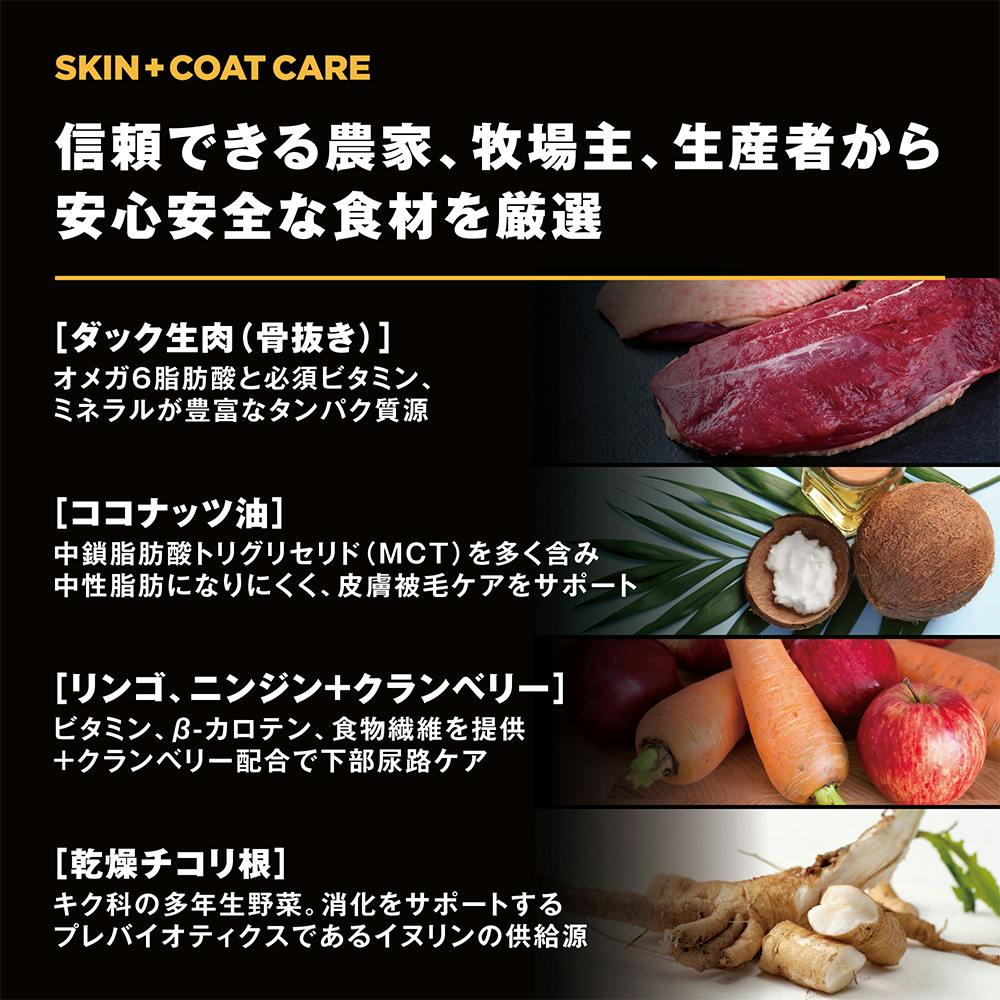 ダックミール、オートミール、全粒玄米、全粒オーツ麦、ダック生肉(骨抜き)、キャノーラ油、リンゴ、ナチュラルフレーバー、ココナッツ油、リン酸二カルシウム、サーモン油、フラックスシード、塩化ナトリウム、乾燥チコリ根、キヌア、その他