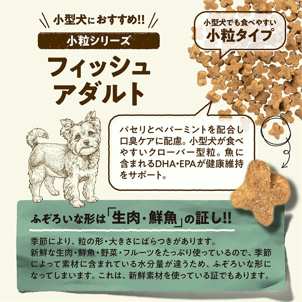 小型犬でも食べやすいフレッシュな鮮魚を主原料にした超小粒タイプのドッグフード。グレインフリー、ミールフリーで安心の美味しさ。