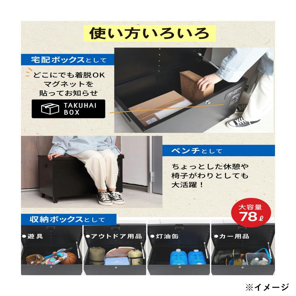 宅配ボックス、収納ボックス、ベンチなど用途に応じていろいろな使い方ができる便利なアイテムです。約78Lの大容量!宅配ボックスとしても、収納ボックスとしても、十分な容量があって収納力抜群。