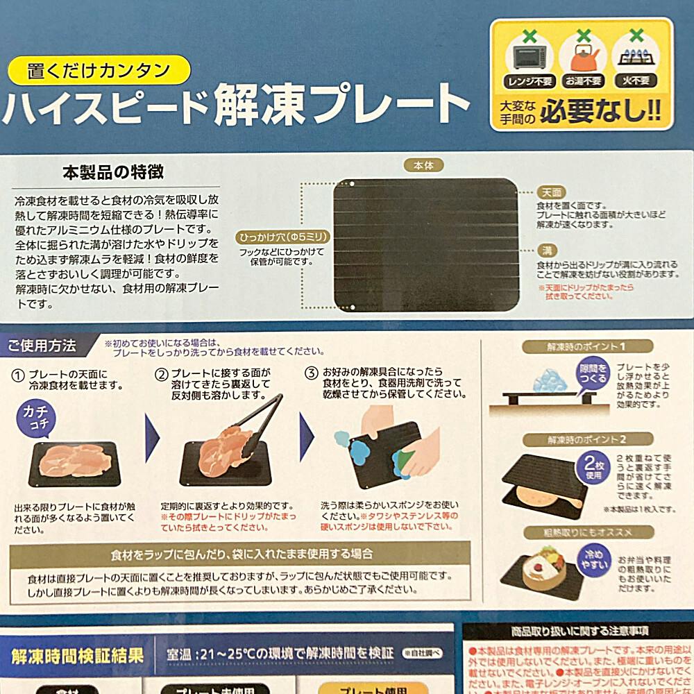 1.プレートの天面に冷凍食材を載せます 2.プレートに接する面が溶けてきたら裏返して反対側も溶かします 3.お好みの解凍具合になったら食材をとり、食器用洗剤で洗って乾燥させてから保管してください。など