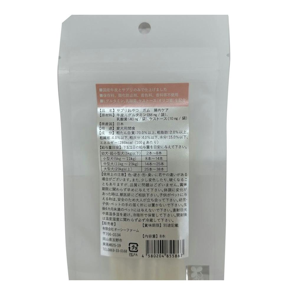 "●国産の牛皮使用 ●保存料、酸化防止剤、着色料、香料等不使用 ●Lグルタミン、乳酸菌、ケストース(オリゴ糖)を配合"