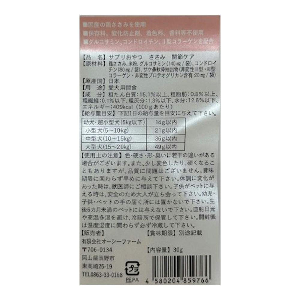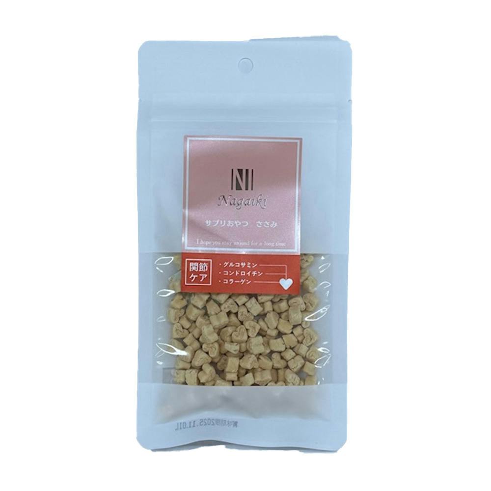 "●国産の鶏ささみ使用 ●保存料、酸化防止剤、着色料、香料等不使用 ●グルコサミン、コンドロイチン、Ⅱ型コラーゲンを配合"