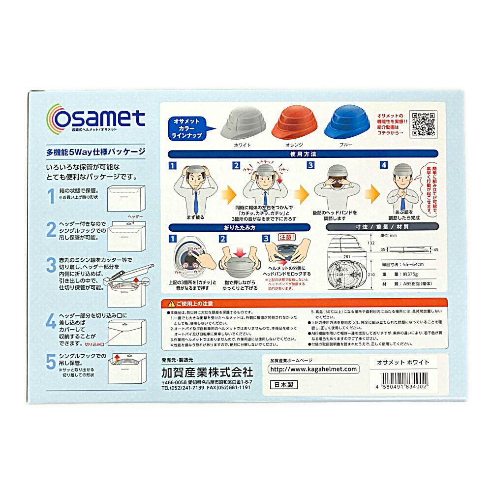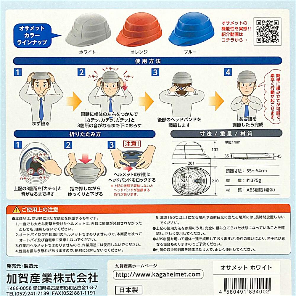 防災用折りたたみ型ヘルメット オサメット 白 KGO-01