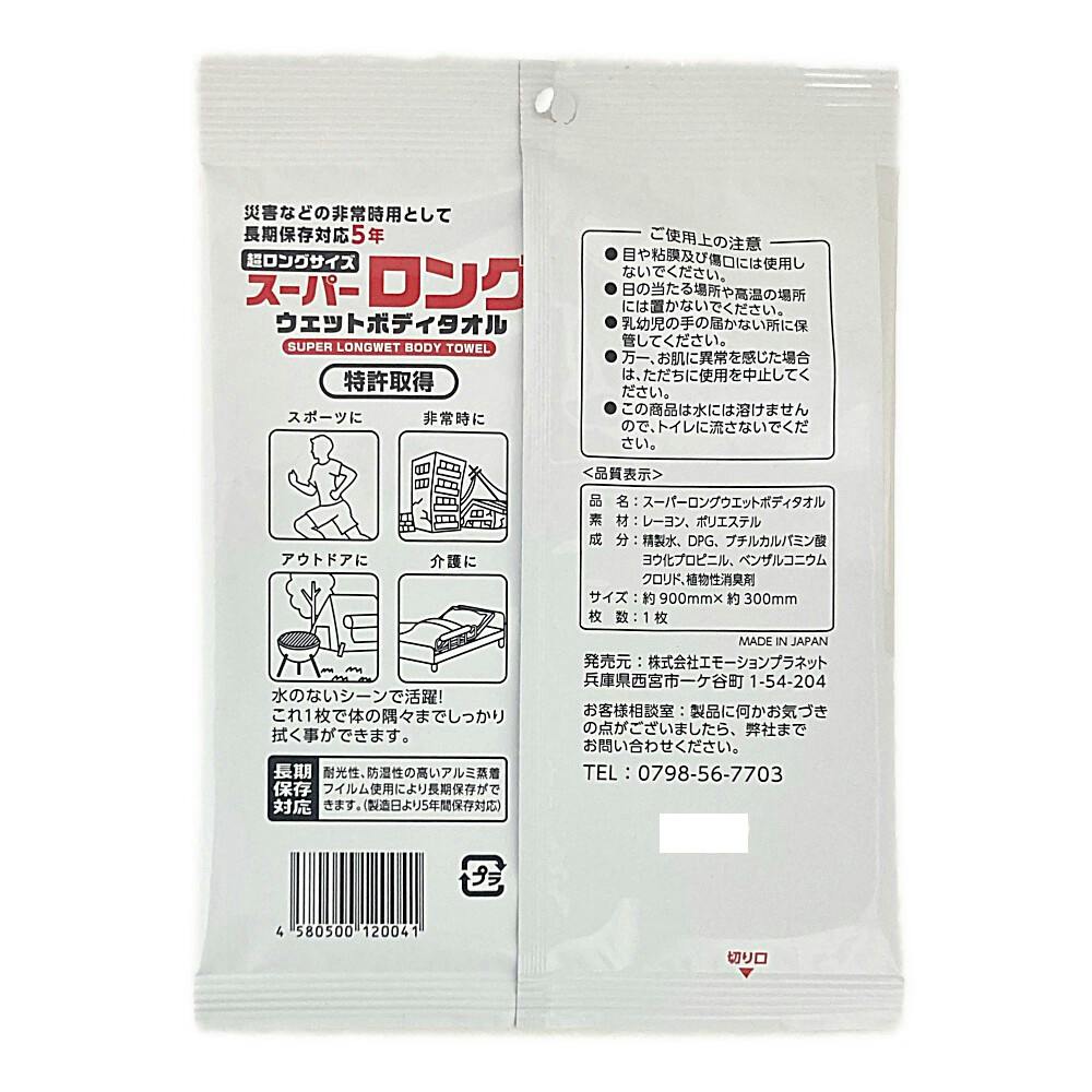 ●この1枚で全身が拭ける超ロングサイズ ●厚手の丈夫な不織布素材でしっかり拭き取り植物性消臭剤配合でシャワー後のような爽快感 ●災害などの非常時用として長期保存対応5年 ●スポーツ・レジャーの後に、キャンプなどアウトドアで