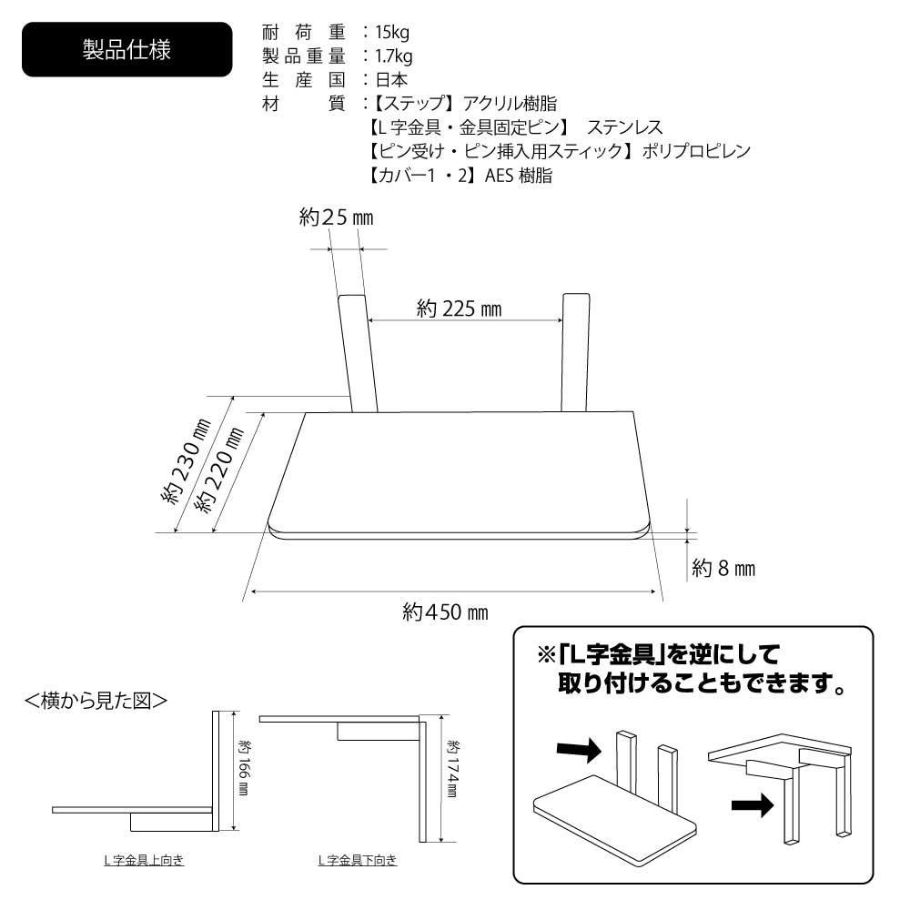 ステップ) アクリル樹脂 (L字金具・金具固定用ピン) ステンレス (ピン受け・ピン挿入用スティック) PP樹脂 (カバー1・カバー2)AES樹