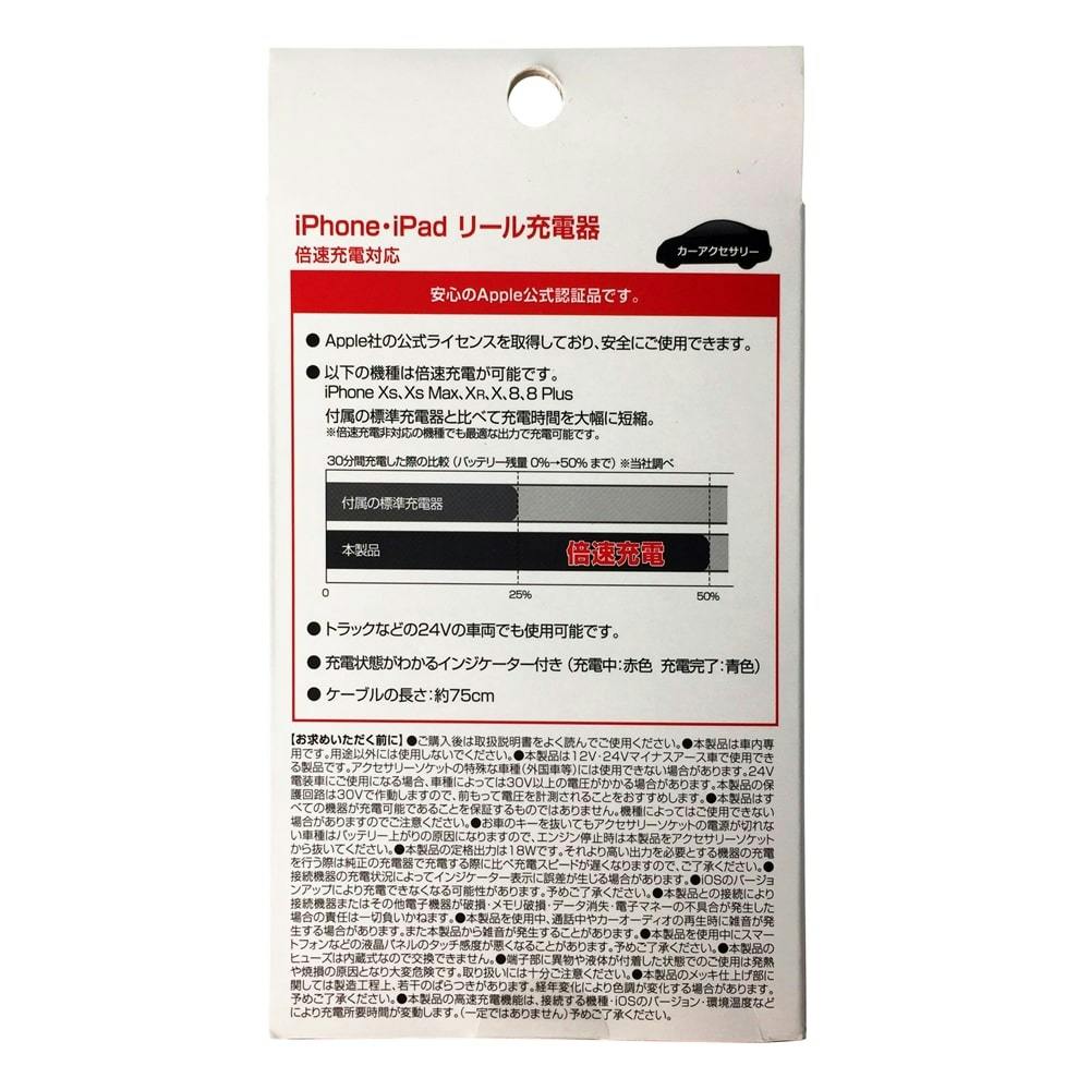 ●iPhone8以降の機種は倍速充電(標準添付の家庭用充電器と比較して最大2倍の速度(0%~50%まで))が可能。●iPhone8以前の機種も接続機種に最適な出力で充電可能です。●Apple正規認証取得品●充電中(赤色点灯)・充電完了(青色点灯)のお知らせ機能付き