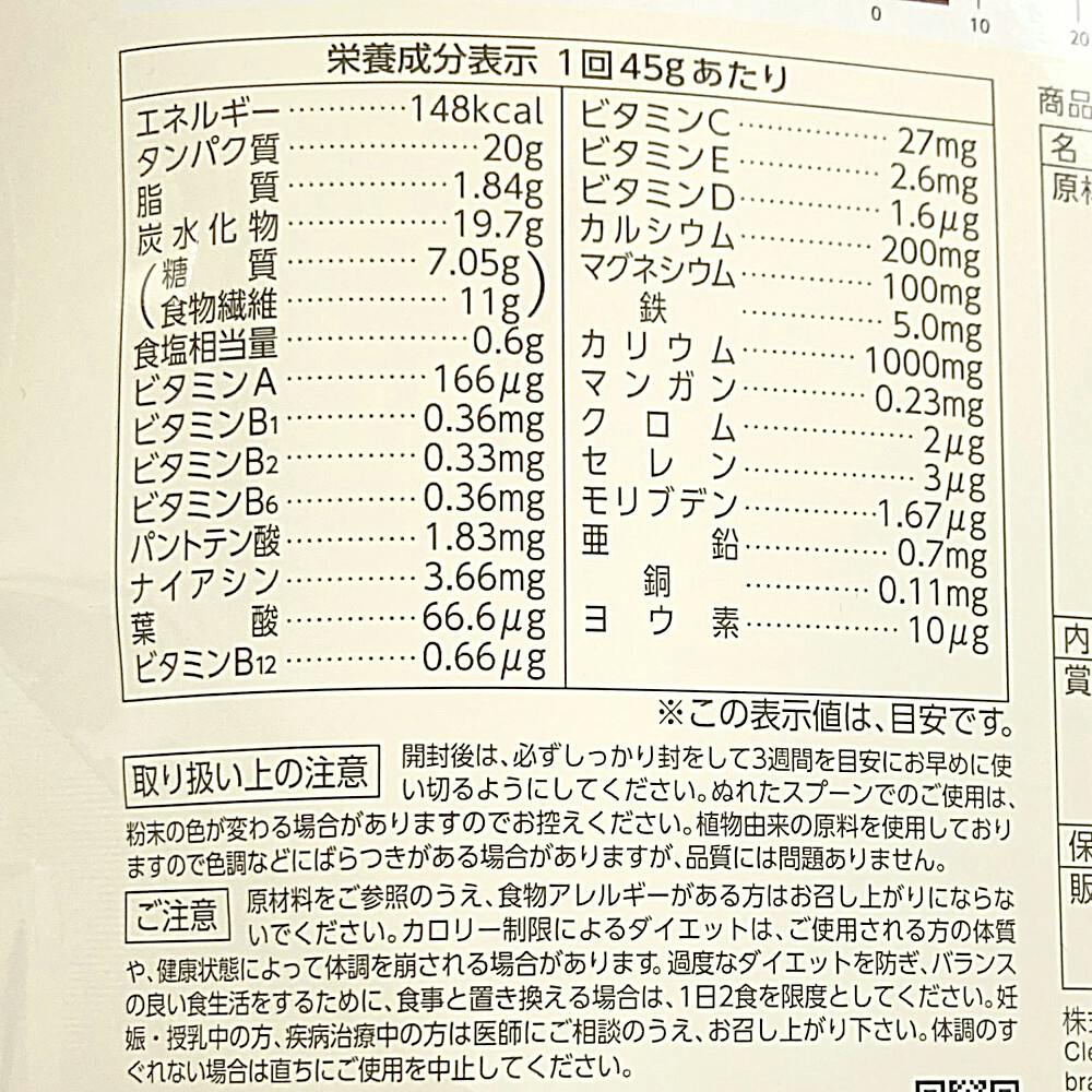 1回45gあたり/エネルギー:148kal 、タンパク質:20g、脂質:1.84g、炭水化物:19.7g(糖質:7.05g、食物繊維:11g)、食塩相当量:0.6g、ビタミンA:166μg 、ビタミンB1:0.36mg、ビタミンB2:0.33mg、ビタミンB6:0.36mg、パントテン酸:1.83mg、ナイアシン:3.66mg など