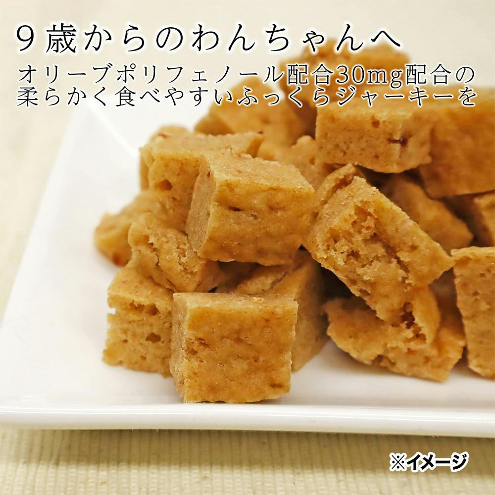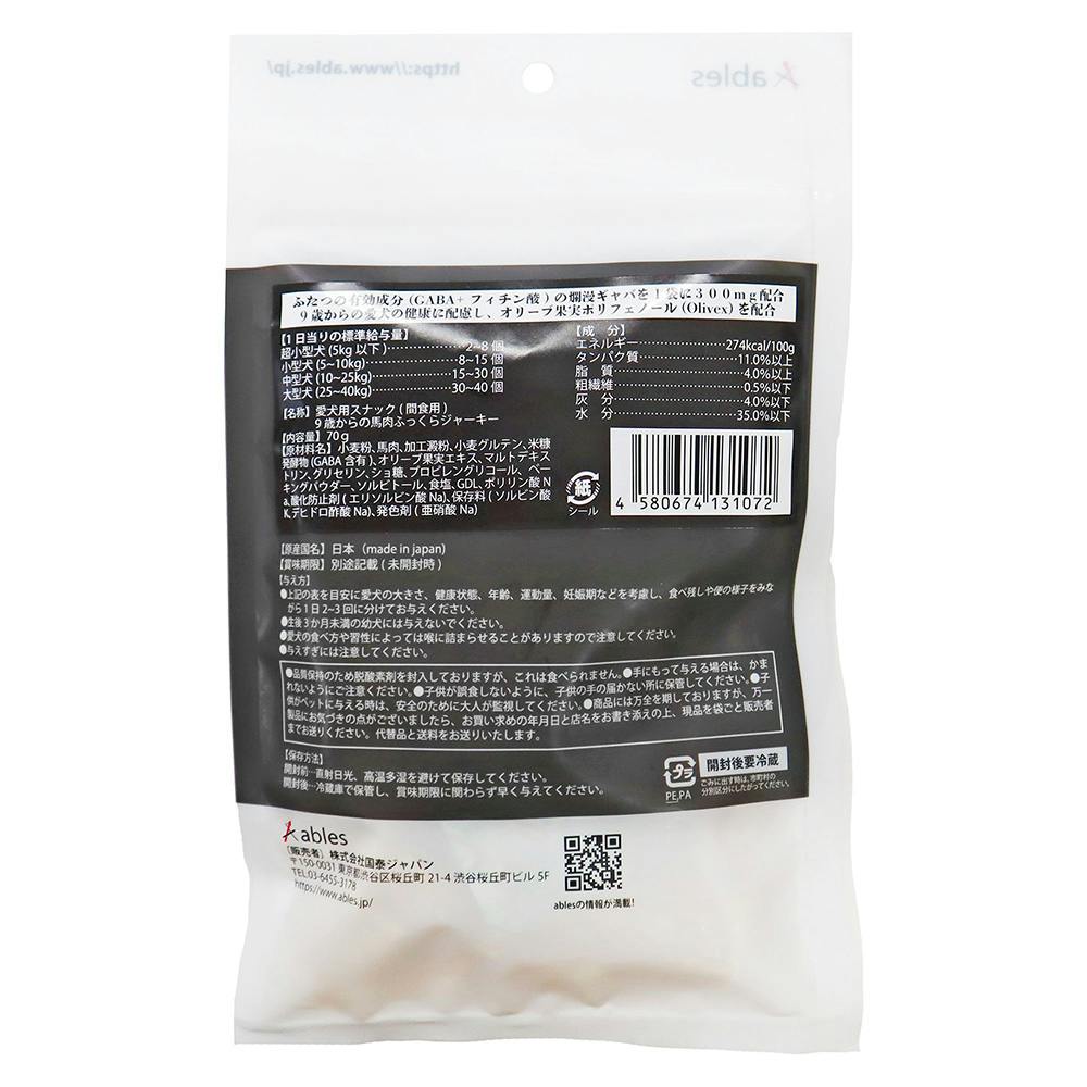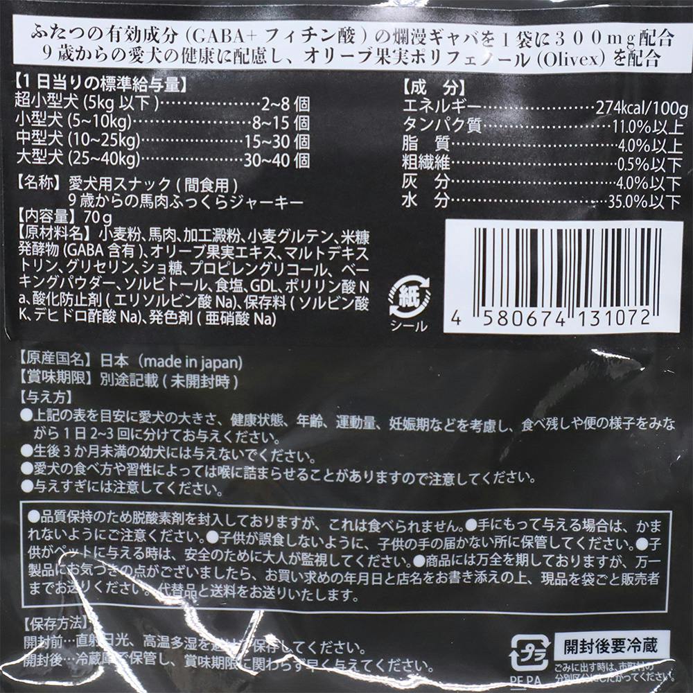 小麦粉、馬肉、加工澱粉、小麦グルテン、米糠発酵物(GABA含有)、オリーブ果実エキス、マルトデキストリン、グリセリン、ショ糖、プロピレングリコール、ベーキングパウダー、ソルビトール、食塩、GDL、ポリリン酸Naなど