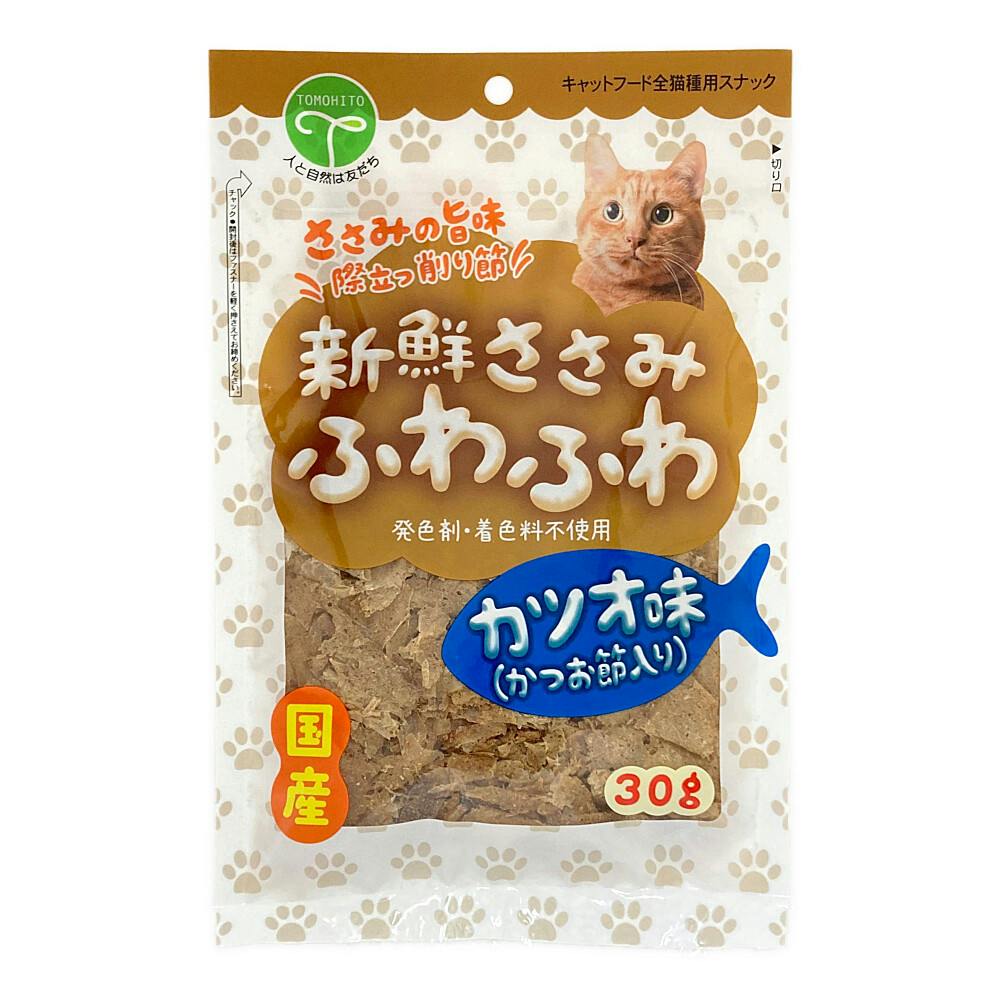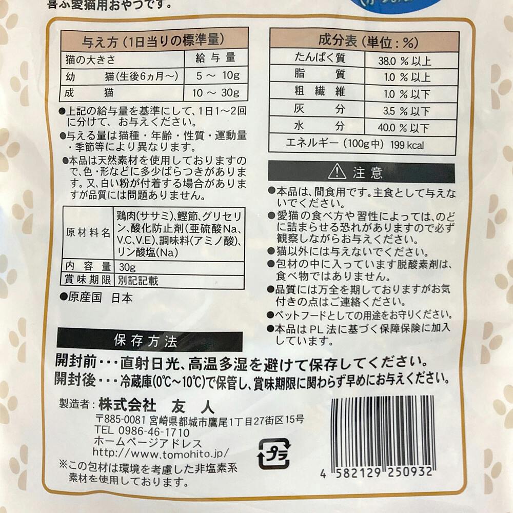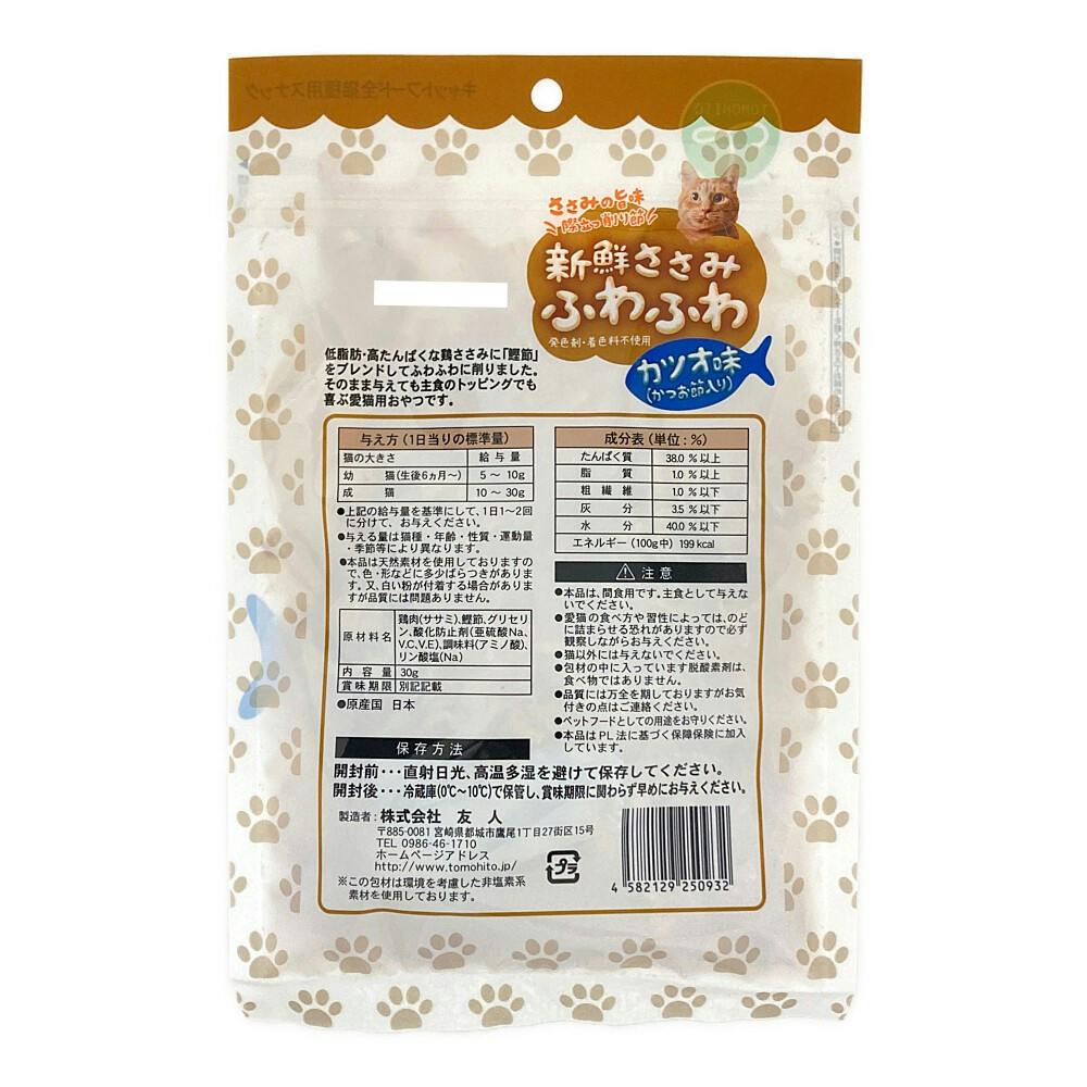●低脂肪・高たんぱくな鶏ささみに「鰹節」をブレンドしてふわふわに削りました ●そのまま与えても主食のトッピンでも喜ぶ愛猫用おやつです