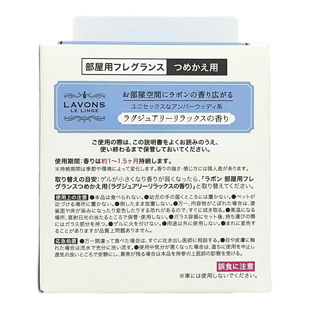 ●使用期間:香りは約1~1.5ヶ月持続します。※持続期間は季節や環境によって変化します。など ●取り替えの目安/ゲルが小さくなり香りが弱くなったら、「ラボン 部屋用フレグランスつめかえ用(ラグジュアリーリラックスの香り)と取り替えてください。