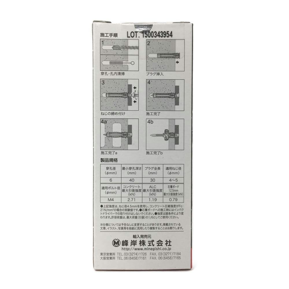 コンクリート圧縮強度214kgf/平方センチメートルでの試験値です。ねじ長さ=プラグ全長+取付物厚さ+ねじ径。ALCに使用する場合は、回転のみの低トルクで施工してください。施工時は保護メガネなどの保護具を使用してください。