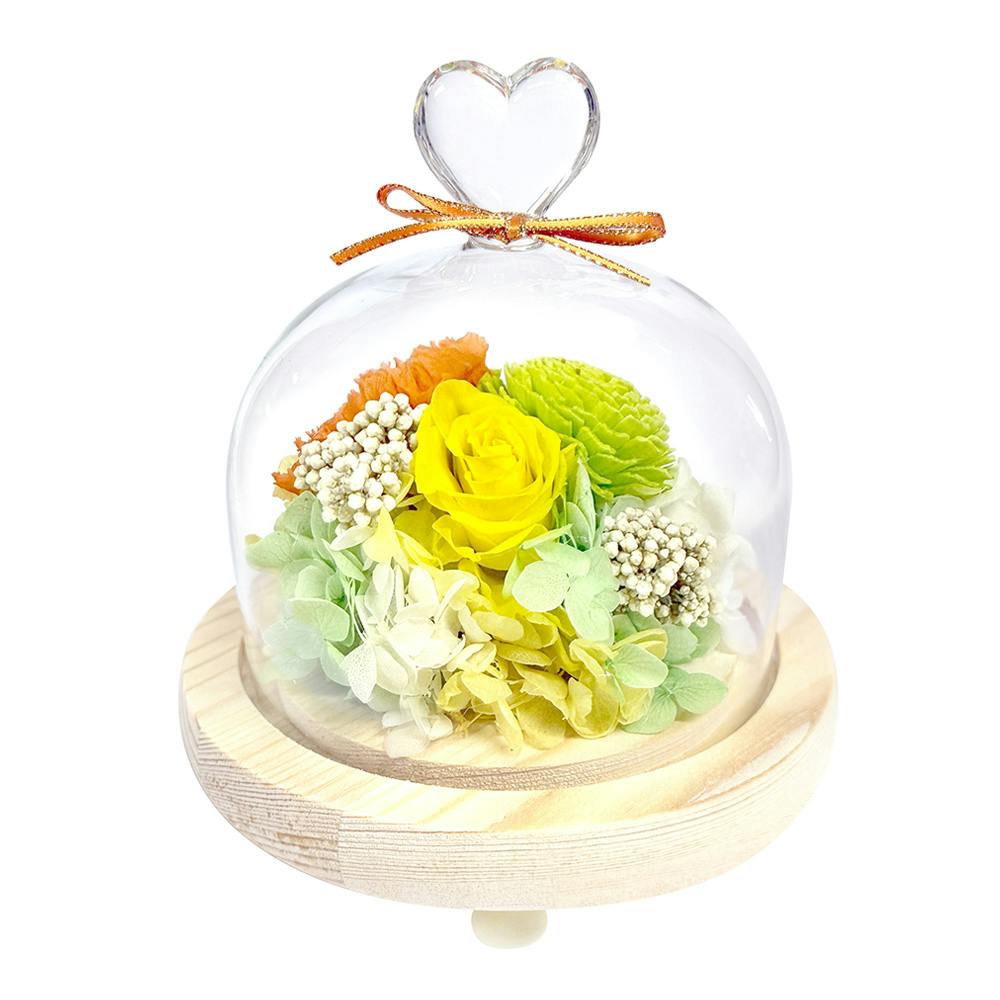 ガラスドームアレンジメントハート/オレンジ+ソーラ