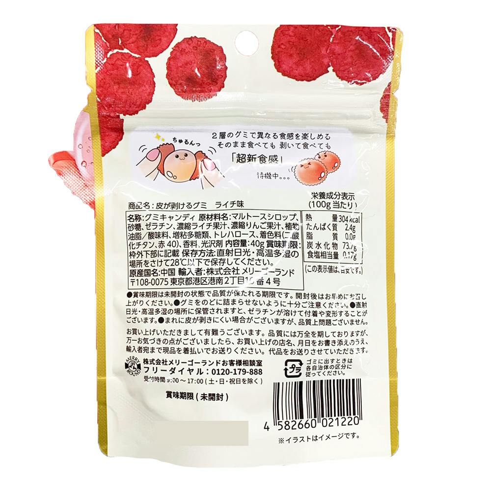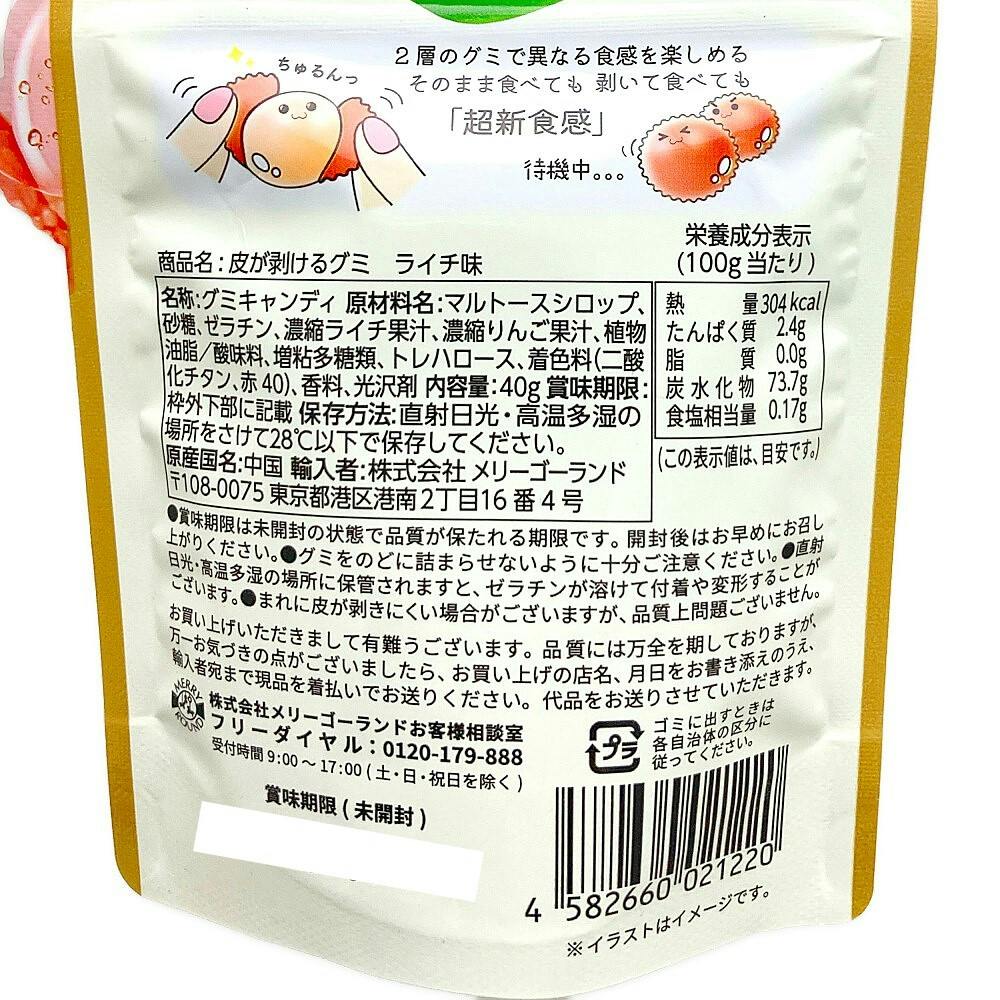 マルトースシロップ、砂糖、ゼラチン、濃縮ライチ果汁、濃縮りんご果汁、植物油脂